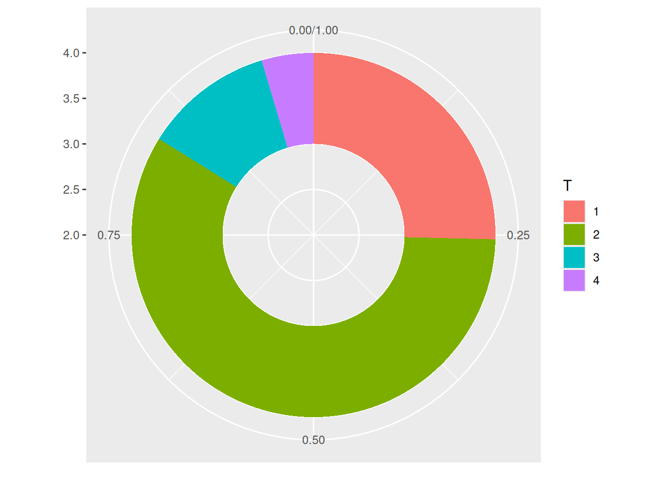A donut chart is a circular plot divided into sectors, each sector representing a part of the whole. It is very similar to a pie chart and can be constructed in ggplot2 and basic R.
