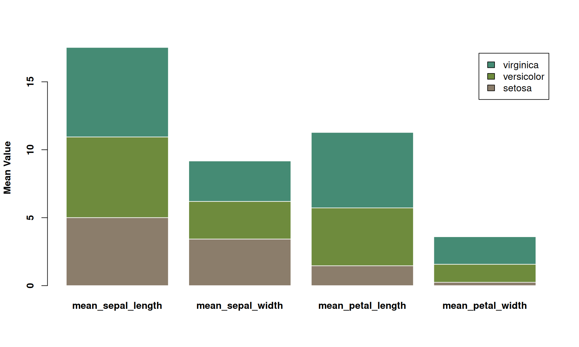 This is a stacked bar chart showing the average values of three iris species (setosa, versicolor, and virginica) across four different measures in the iris dataset. The bars are stacked, so the total height shown is the sum of the averages for all three species. The x-axis (Measurement): Similar to the previous chart, it represents the four measurements (calyx length, calyx width, petal length, and petal width). The y-axis (Mean Value): Represents the overall average of these measurements (the stacked averages of all species). Different colors represent the different iris species: setosa (red), versicolor (green), and virginica (blue). The total bar height for each measurement represents the overall mean for all three species, while the different colors within the bars represent the contribution of each species to that measurement.