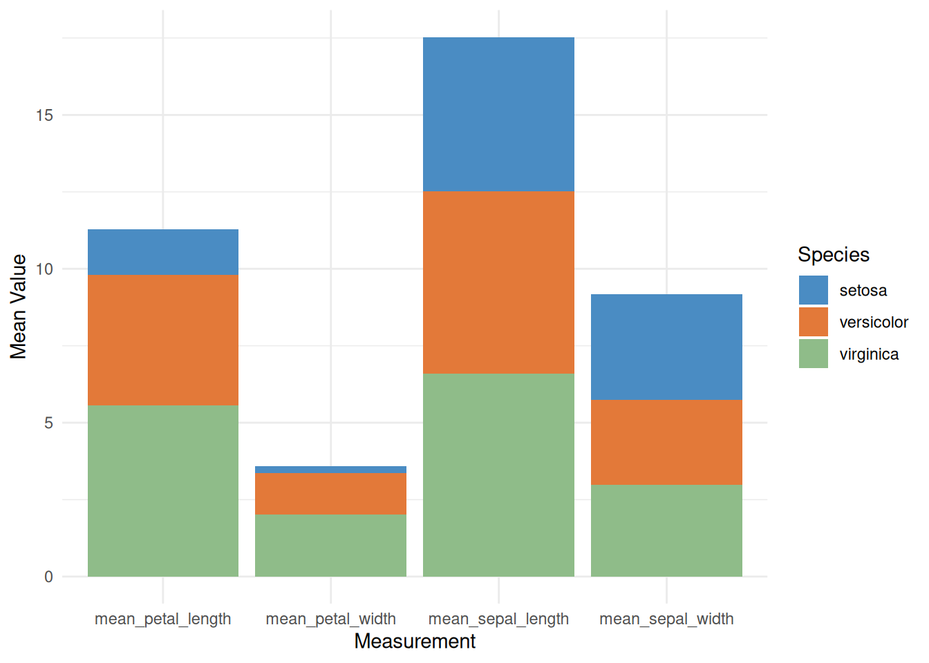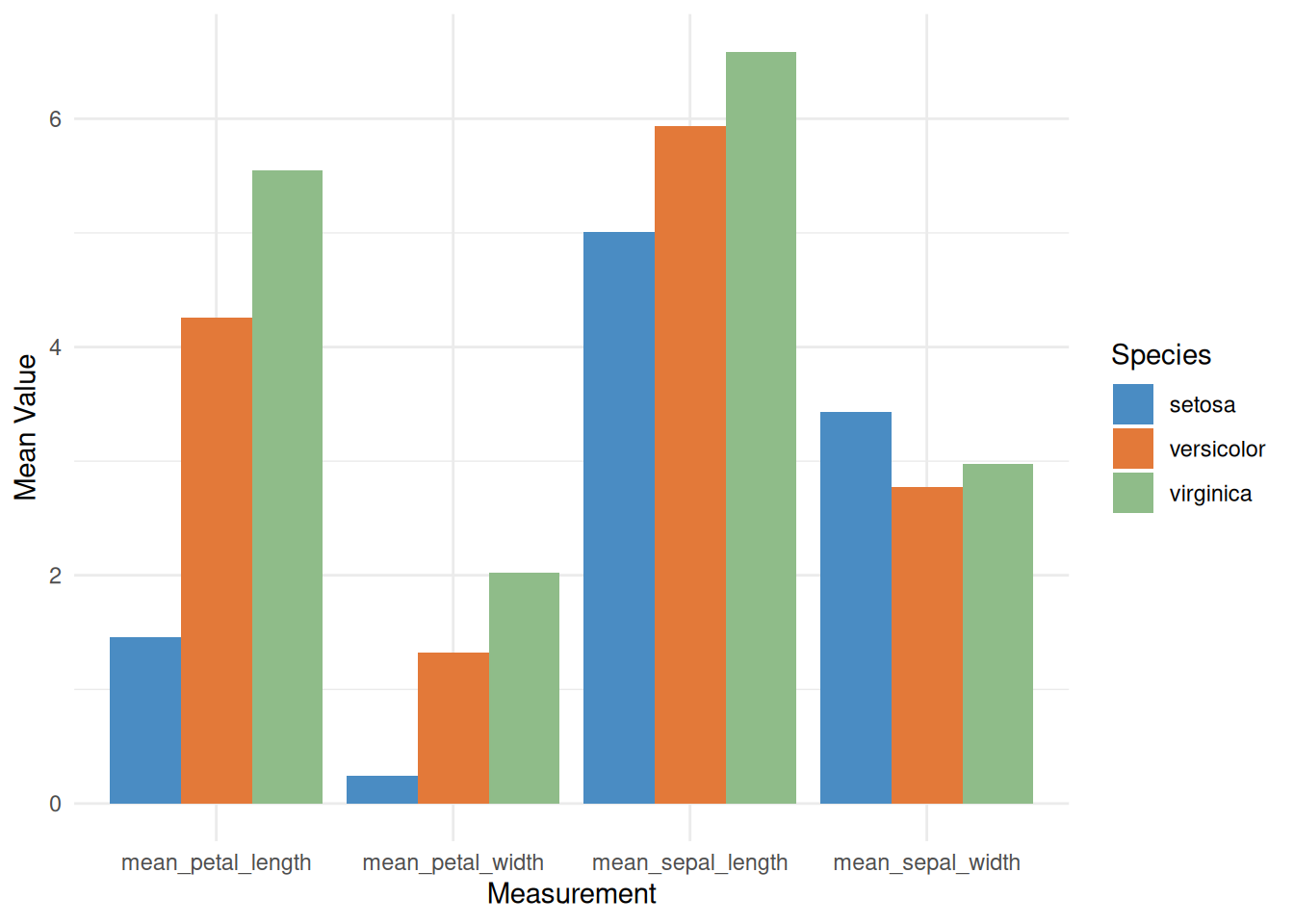 p <- ggplot(iris_means_long, aes(fill = Species, y = Value, x = Measurement)) +