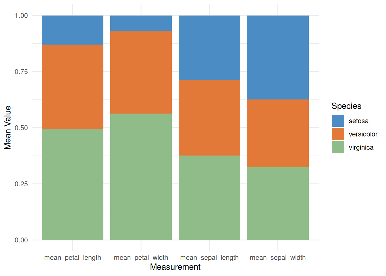 This percentage-stacked bar chart displays the relative averages of different iris species (setosa, versicolor, and virginica) across various measurements, such as sepal length, sepal width, petal length, and petal width. By using a stacked fill method, the chart visually shows the relative contribution of each species to each measurement, helping us understand the characteristic differences between species. This visualization facilitates the identification of key characteristics of each species and aids in further classification and comparative analysis.