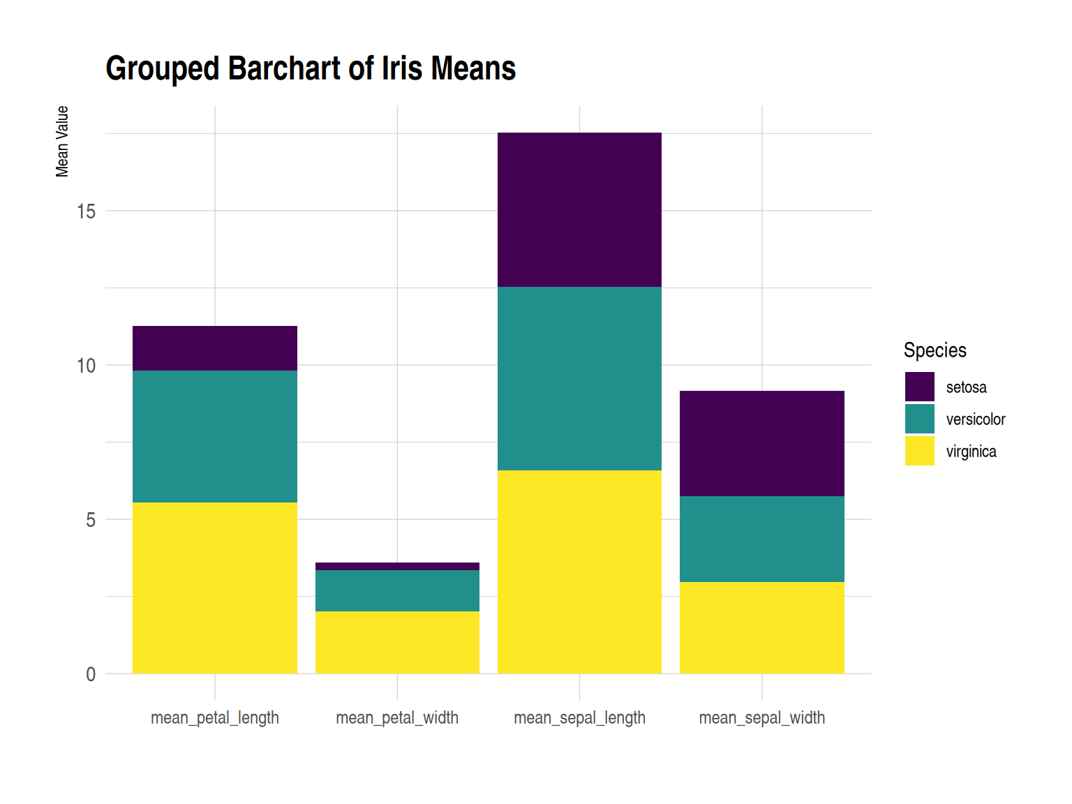 This grouped bar chart displays the average values (calyx length, calyx width, petal length, and petal width) of three iris species (setosa, versicolor, and virginica) across four different measures. Each measure is represented by three bars side-by-side, each corresponding to the average value of one of the three species. The three species are distinguished by color, and the chart visually illustrates their differences across the various measures. Significant differences in certain characteristics between the different species are clearly visible.