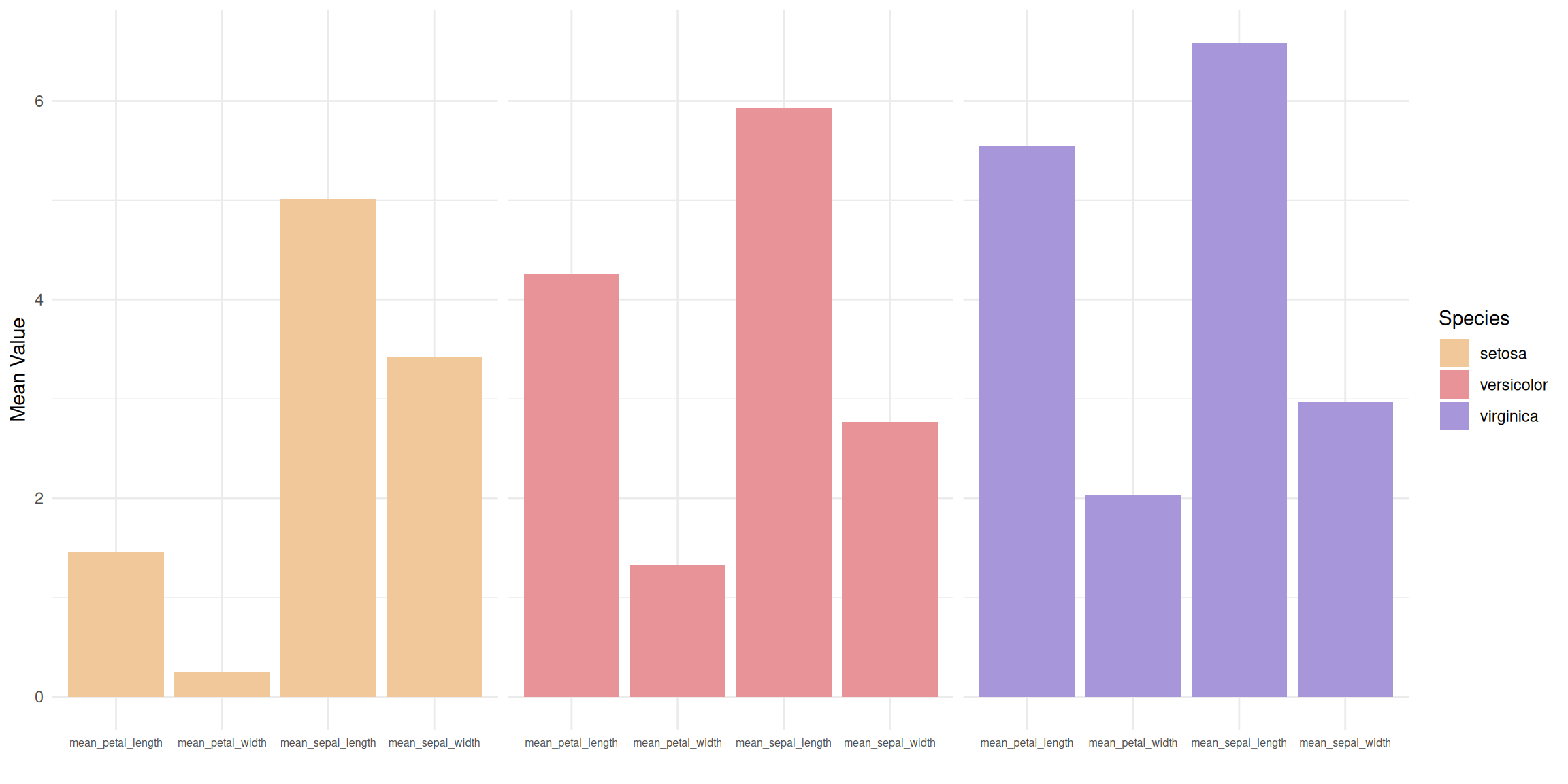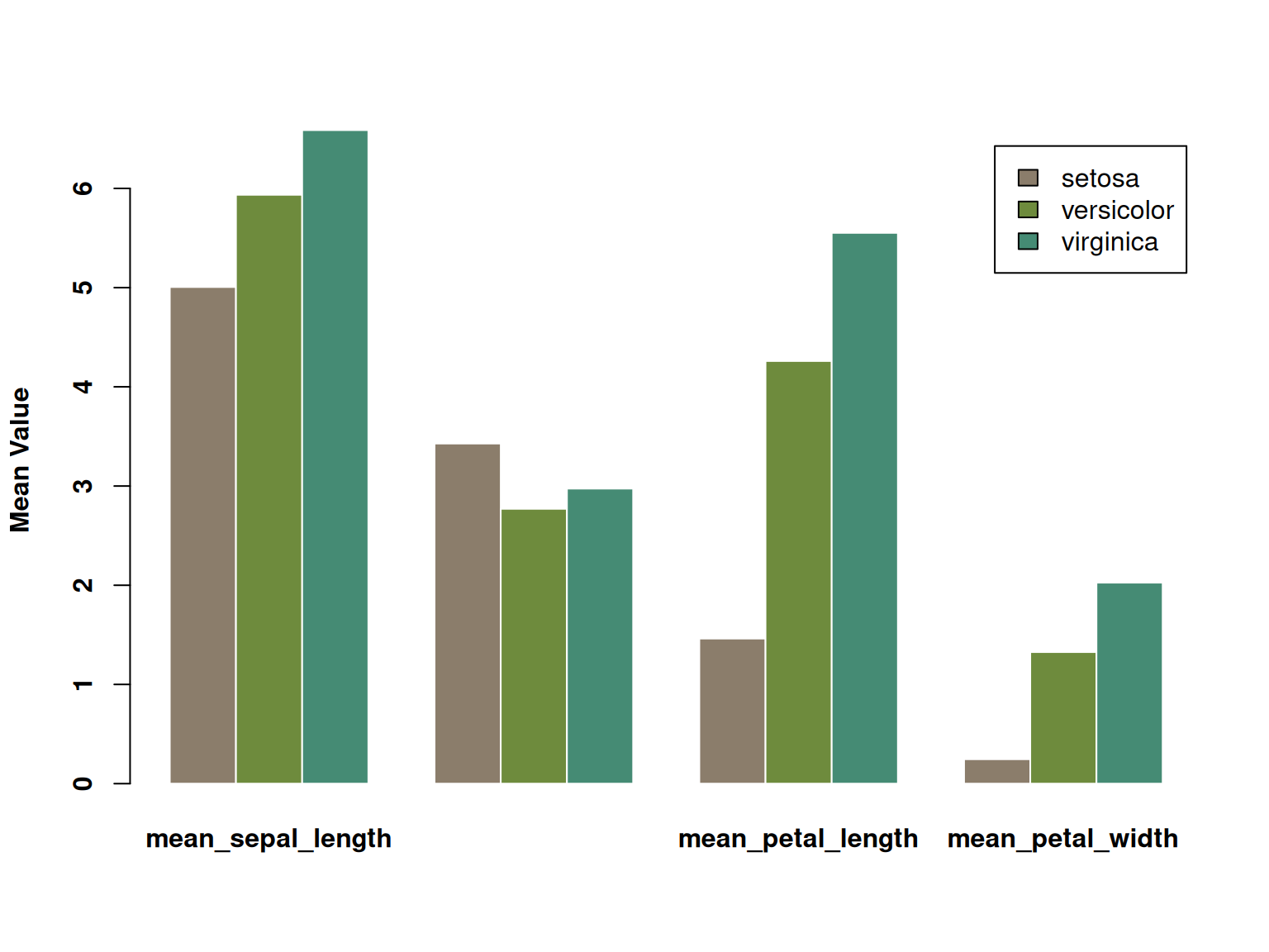 This is a grouped bar chart showing the average values (calyx length, calyx width, petal length, and petal width) of three iris species (setosa, versicolor, and virginica) in the iris dataset across four different measures. The x-axis represents the four measures, and the y-axis (mean value) represents the average of these measures. The different colored bars (Species) represent the three iris species: setosa (red), versicolor (green), and virginica (blue). For each measure, the average values for the three flowers are displayed side-by-side in a bar chart.