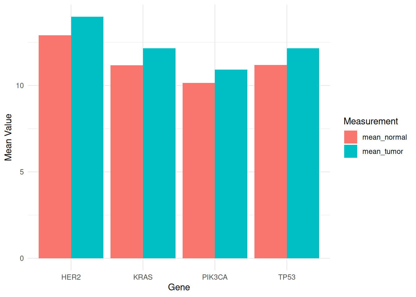 This grouped bar chart shows the average expression levels of different genes (PIK3CA, KRAS, TP53, and HER2) in tumor and normal samples from the TCGA-STAD.star_counts dataset. Different fill colors distinguish tumor and normal samples, facilitating comparison of gene expression differences between the two states. This visualization helps reveal the potential roles of genes in tumor biology and provides important information for future research.