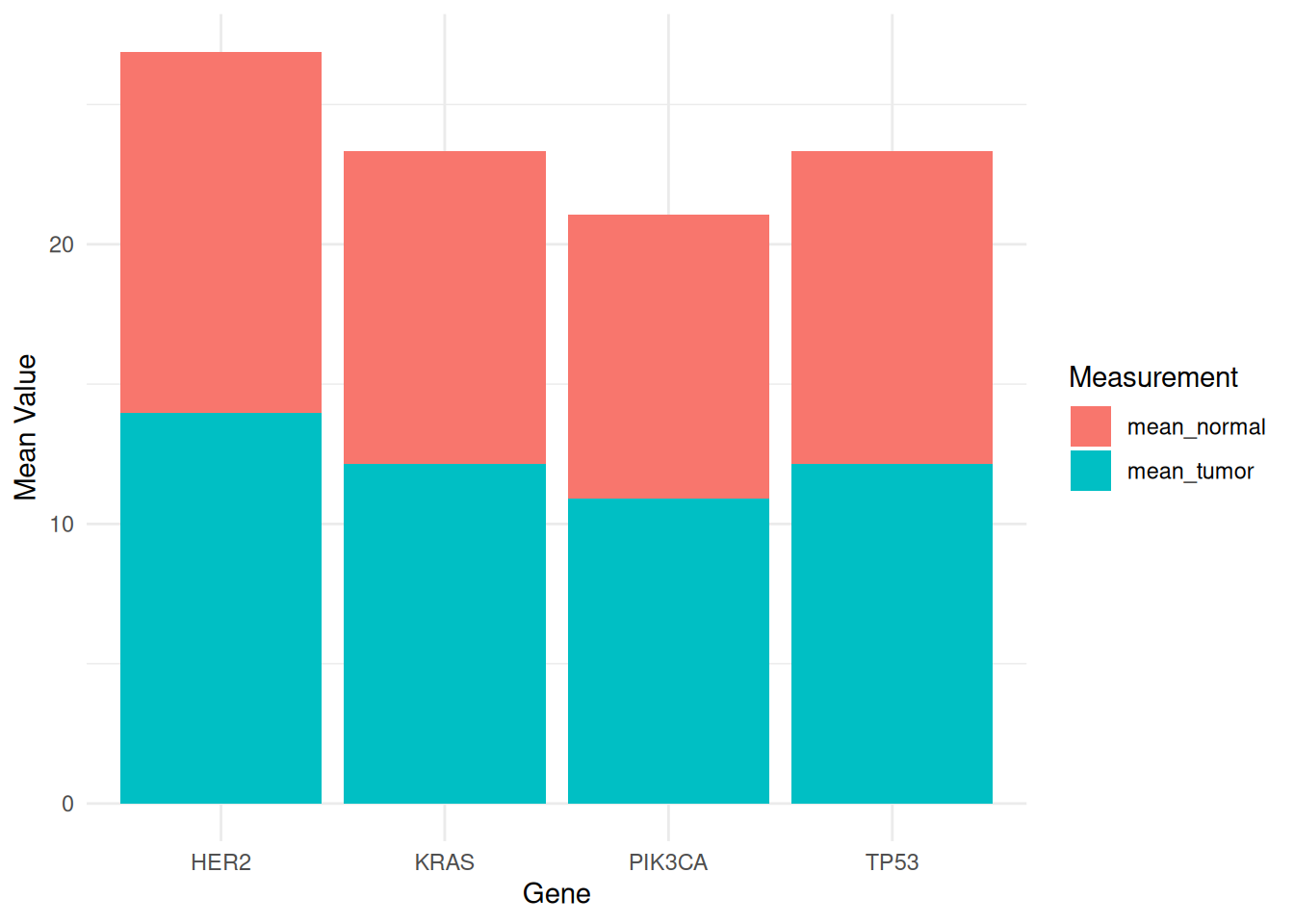 This stacked bar chart displays the mean expression levels of different genes (PIK3CA, KRAS, TP53, and HER2) in tumor and normal samples from the TCGA-STAD.star_counts dataset. Tumor and normal samples are distinguished by different fill colors to facilitate comparison of gene expression differences between the two states. The stacked bar chart also allows comparison of the overall mean values of different measurements, as well as the relative contribution of each species to each measurement.