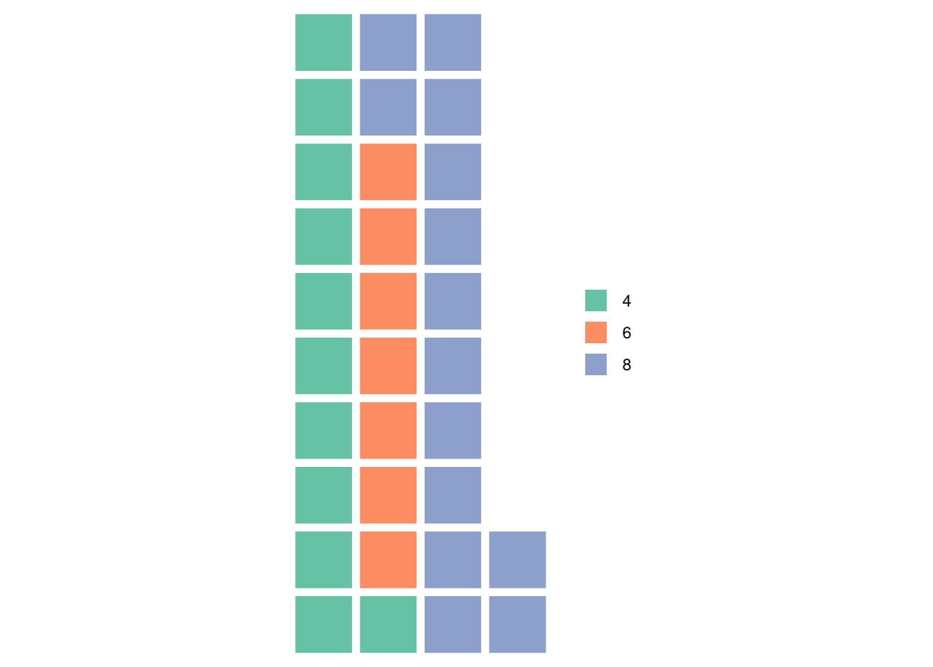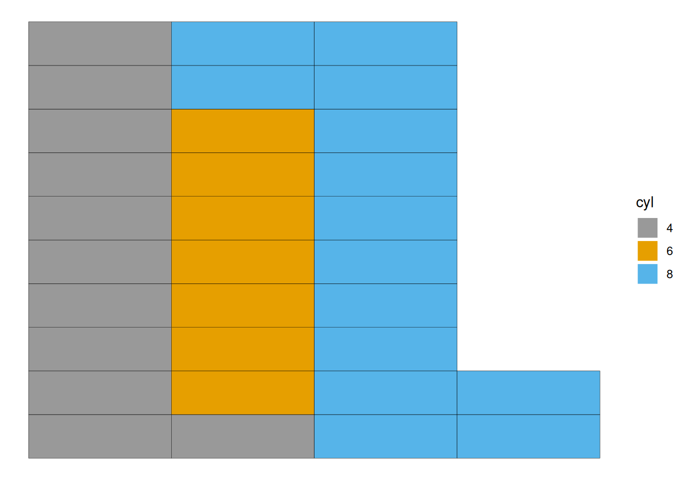 ggplot(counts1, aes(fill=cyl, values=Freq)) +