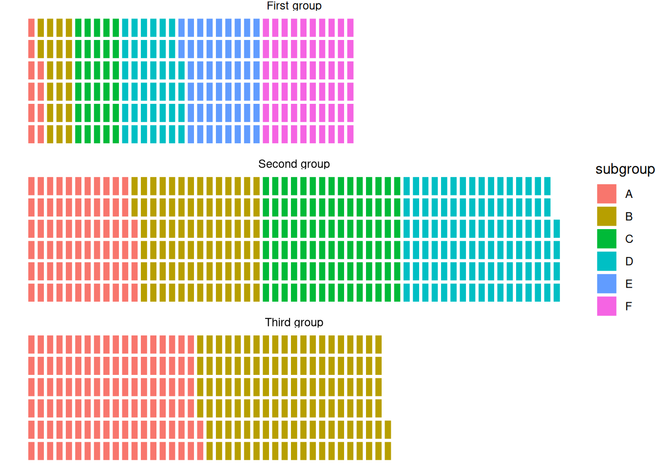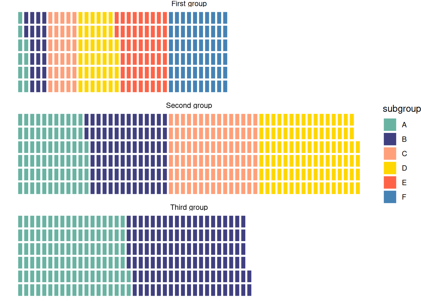 This waffle chart shows the distribution of elements within three different groups in the dataset.