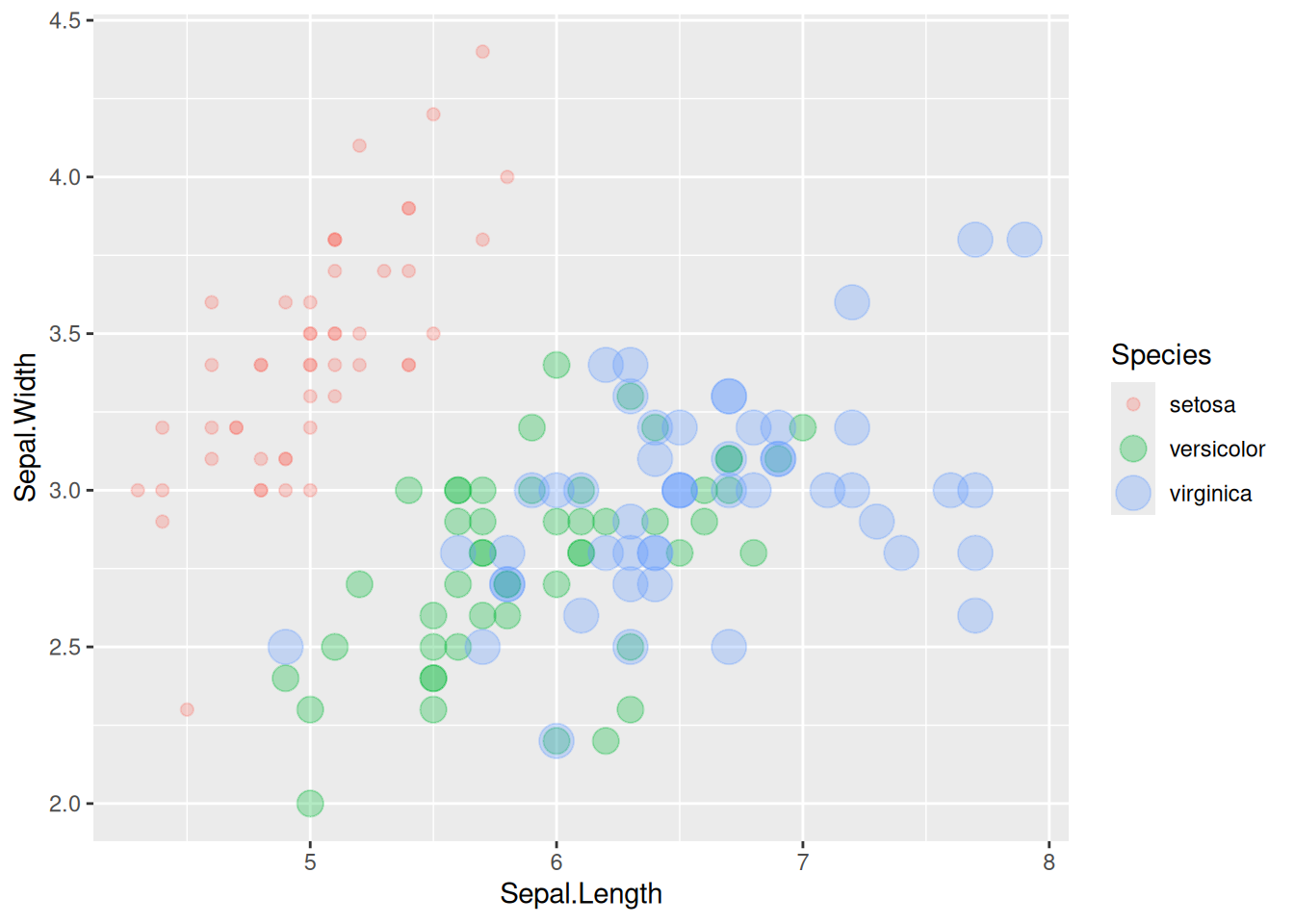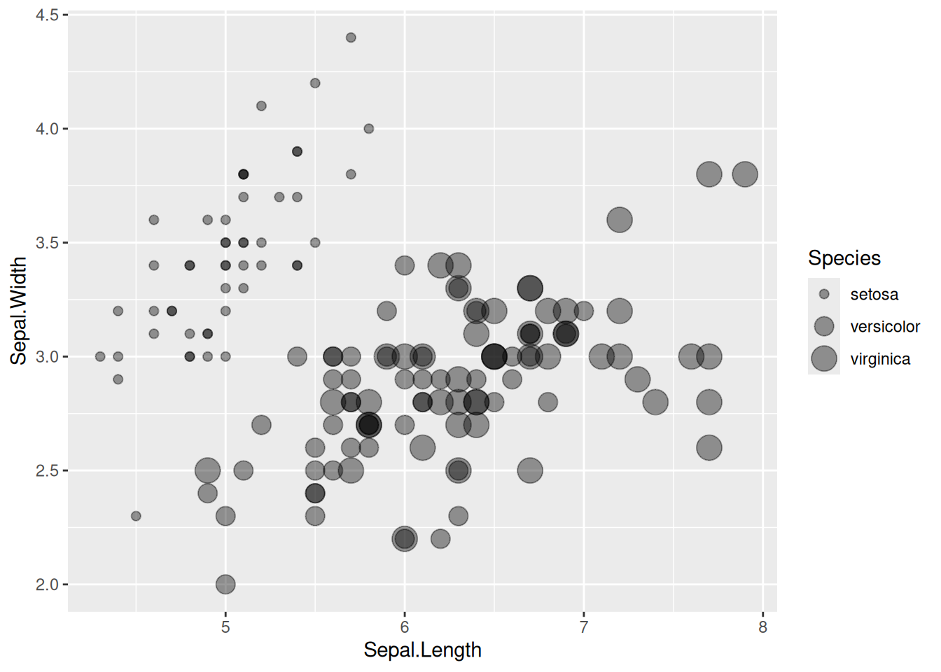 p <- ggplot(iris, aes(x=Sepal.Length, y=Sepal.Width, size = Species)) +
