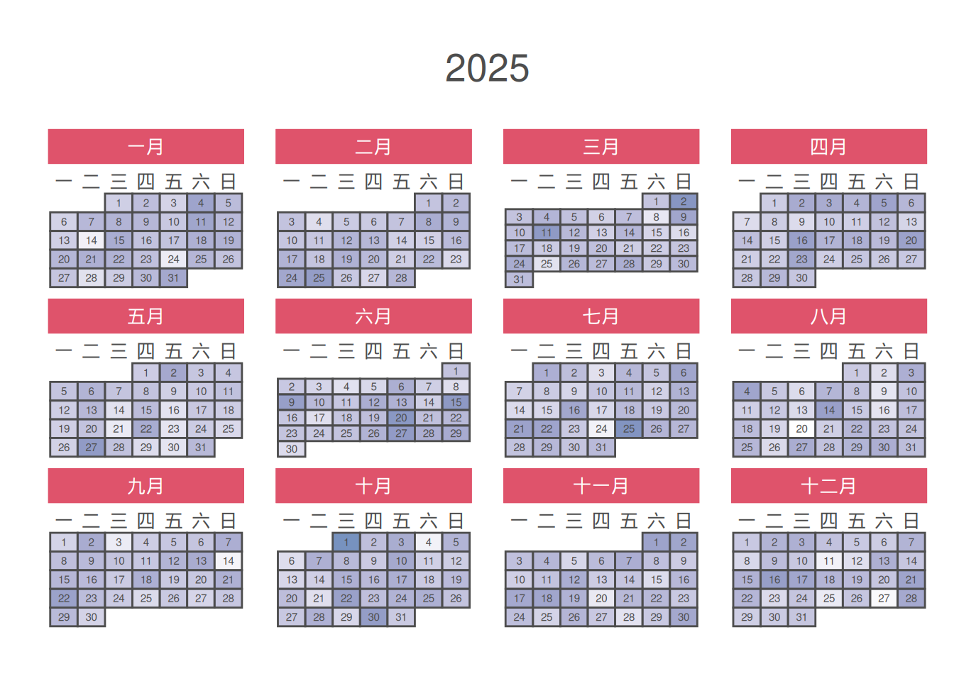 The data is the calendar data for a specified year, and certain date ranges can be selected to be highlighted.