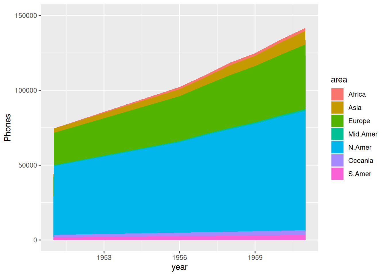 p <- ggplot(data_WorldPhones, aes(x=year, y=Phones, fill=area)) +