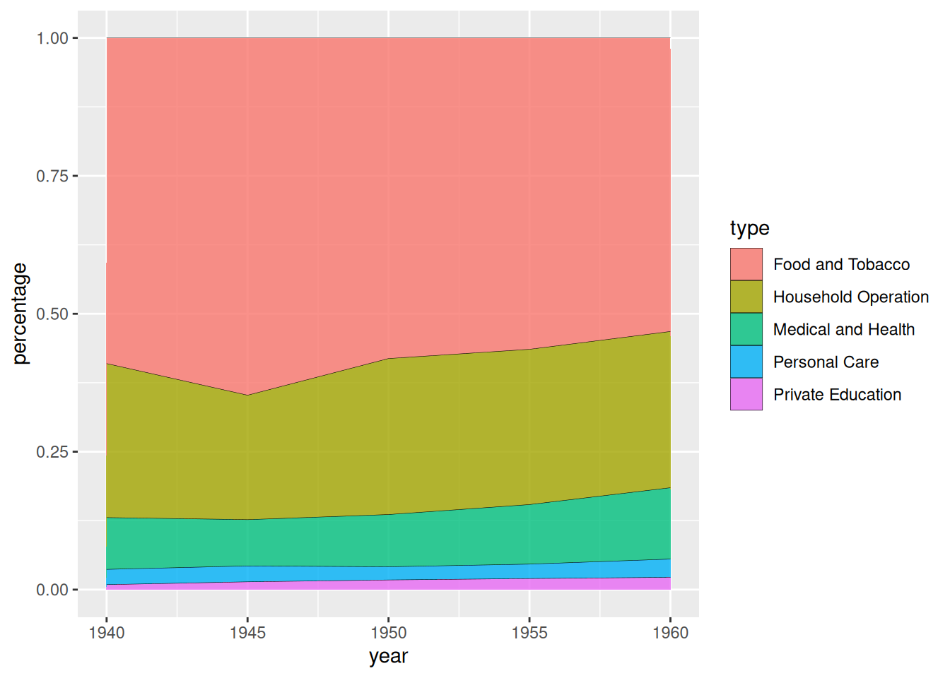 p <- ggplot(data_USPersonalExpenditure1, aes(x=year, y=percentage, fill=type)) +