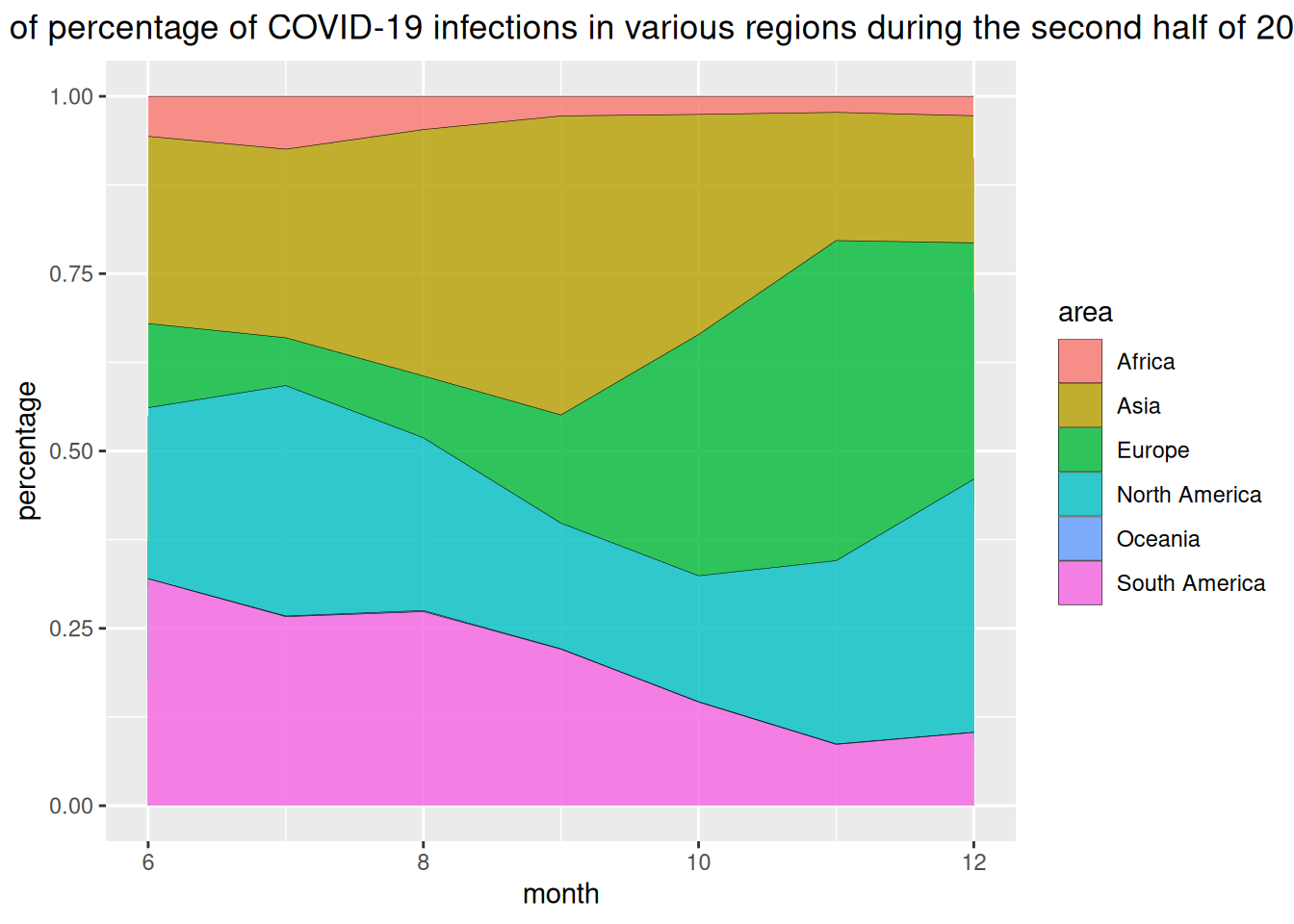 ggtitle("Stacked chart of percentage of COVID-19 infections in various regions during the second half of 2020")