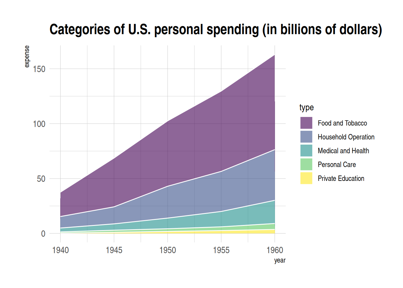 p <- ggplot(data_USPersonalExpenditure, aes(x=year, y=expense, fill=type)) +