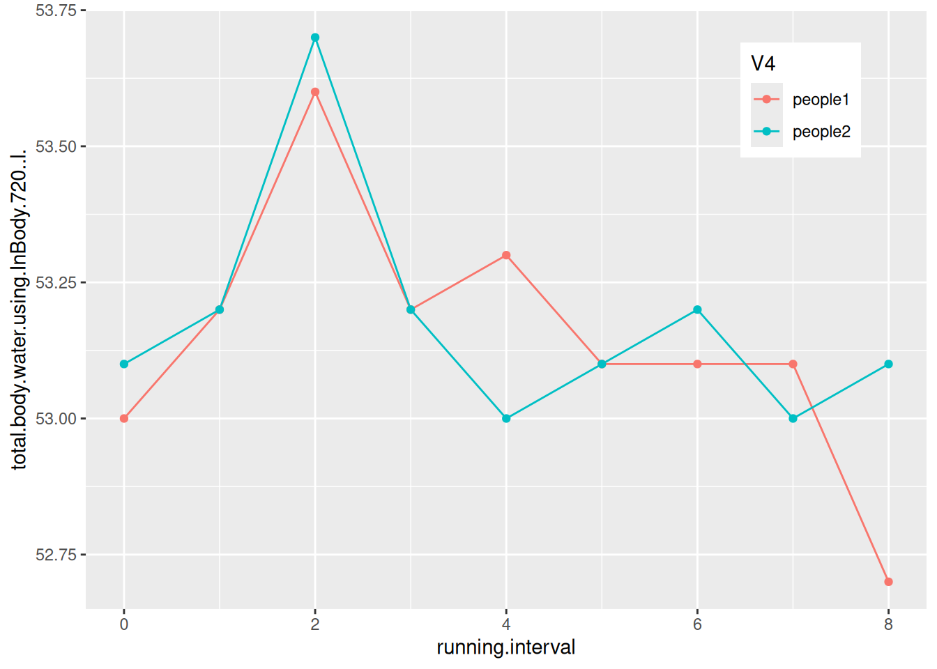 p <- ggplot(data_water, aes(x = V2, y = V3, group = V4)) + # V4 category labels are mapped to grouping and color features.