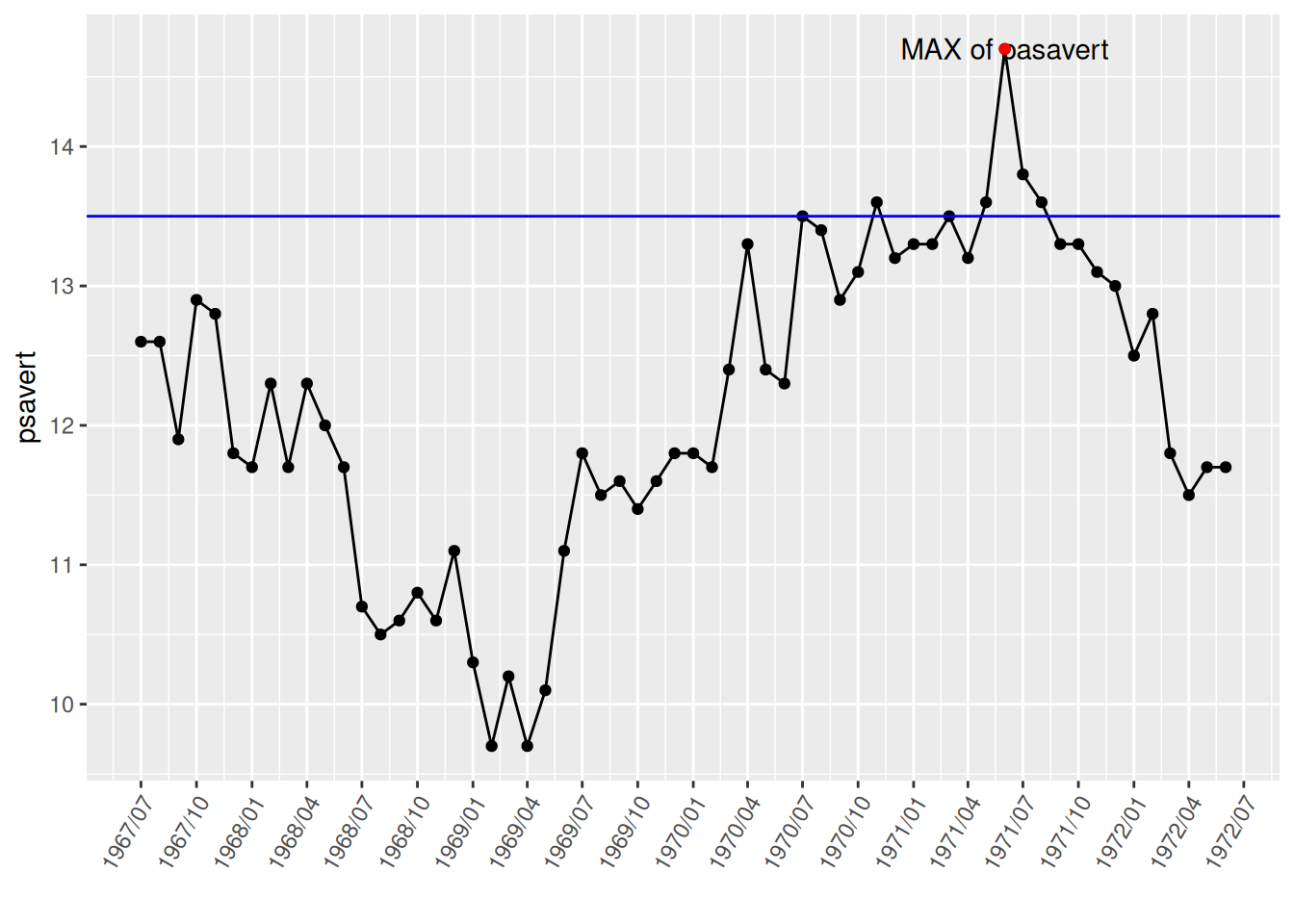 annotate(geom="text",x=as.Date("1971-06-01"),y=14.7,label="MAX of pasavert")+