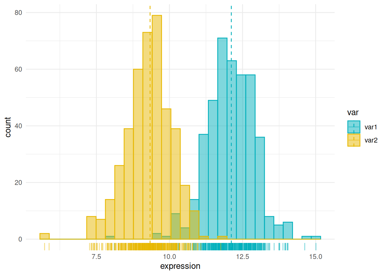 p <- ggplot(data12, aes(x = expression, fill = var)) +