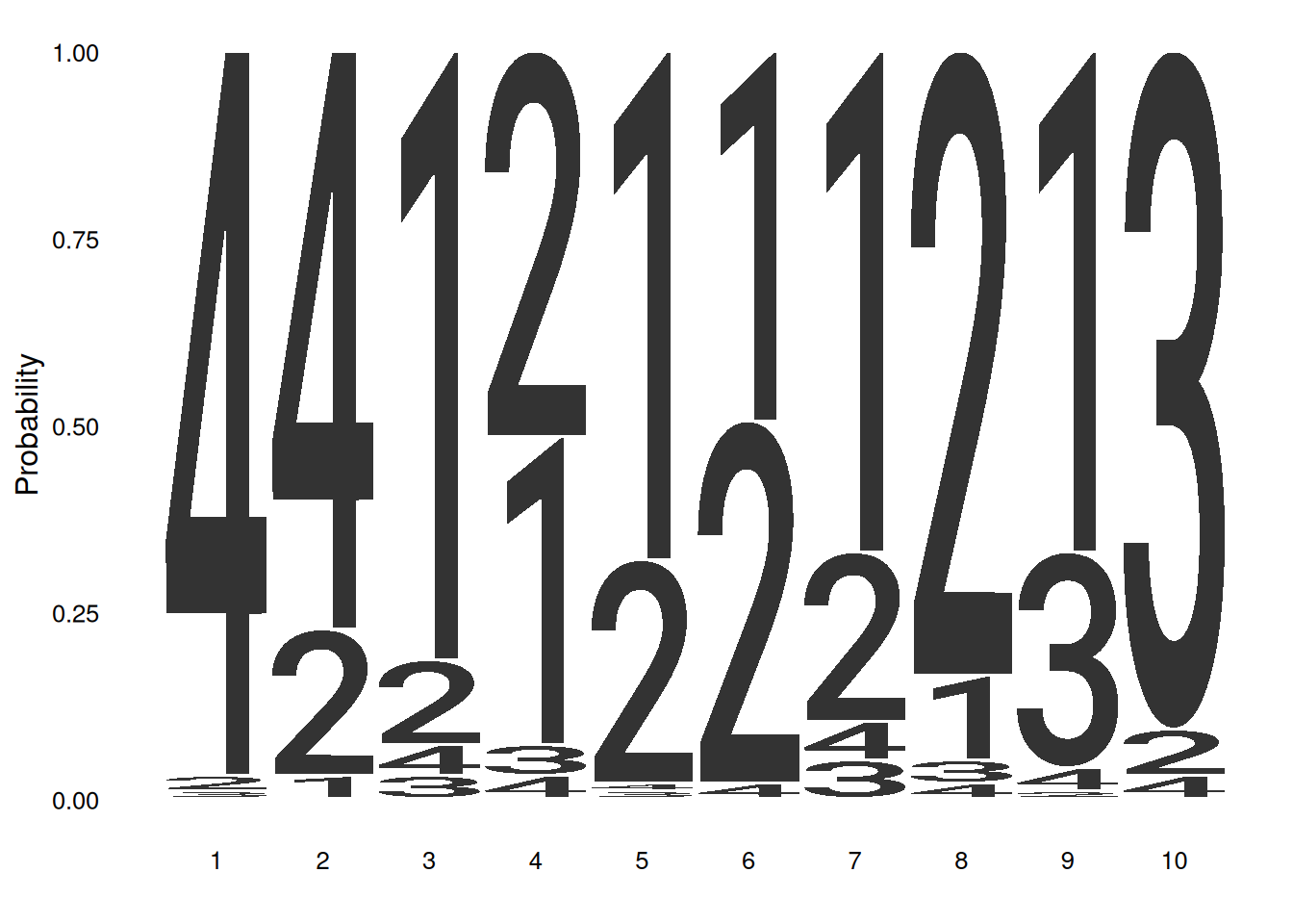 ggseqlogo(seqs_numeric, method='prob', namespace=1:4)