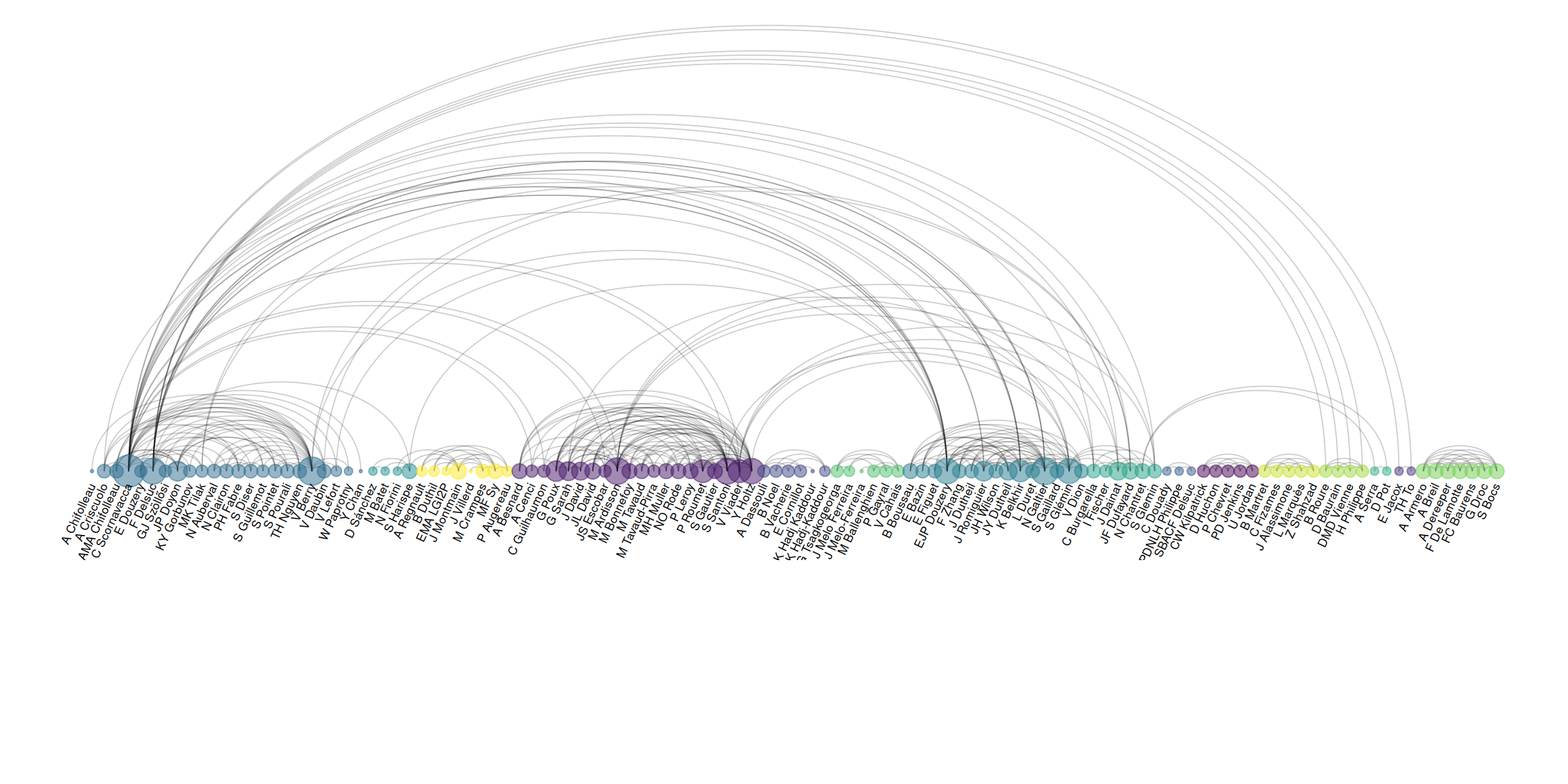 Typical raw data often contains many nodes and edges, resulting in complex graph structures. When plotting, nodes need to be categorized and sorted, and the size of nodes and edges needs to be measured to display an aesthetically pleasing arc graph. This study uses co-authored network data from researchers.