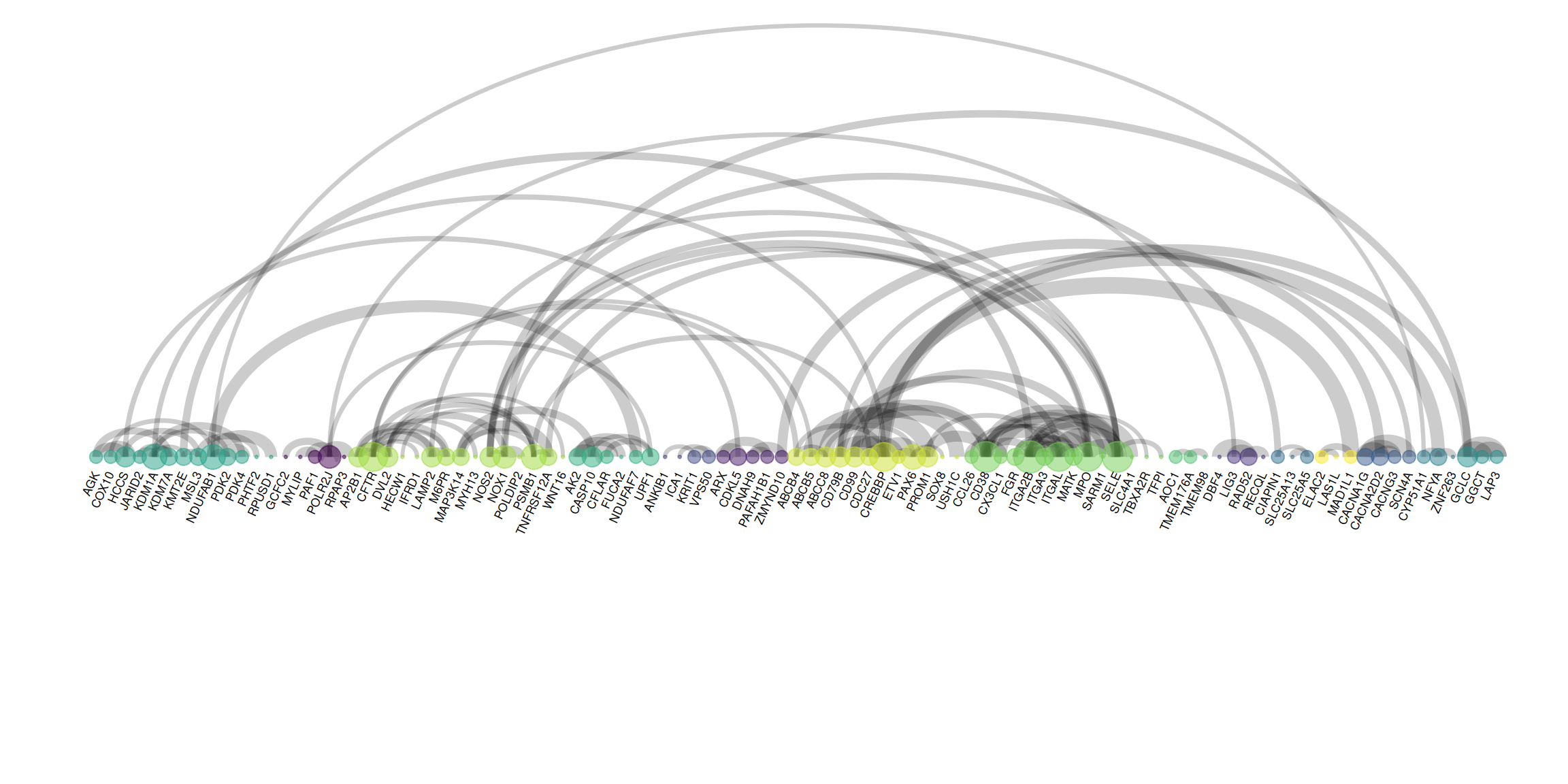 The figure shows an arc graph drawn using PPI edge data. Nodes represent genes, arcs represent relationships between genes, and the thickness of the arcs represents the weight (strength) of the relationships between genes. Unlike the previous figure, the edge information is extracted, and edge_width = connect$combined_score is used in the drawing process to map the weights to the thickness of the arcs.