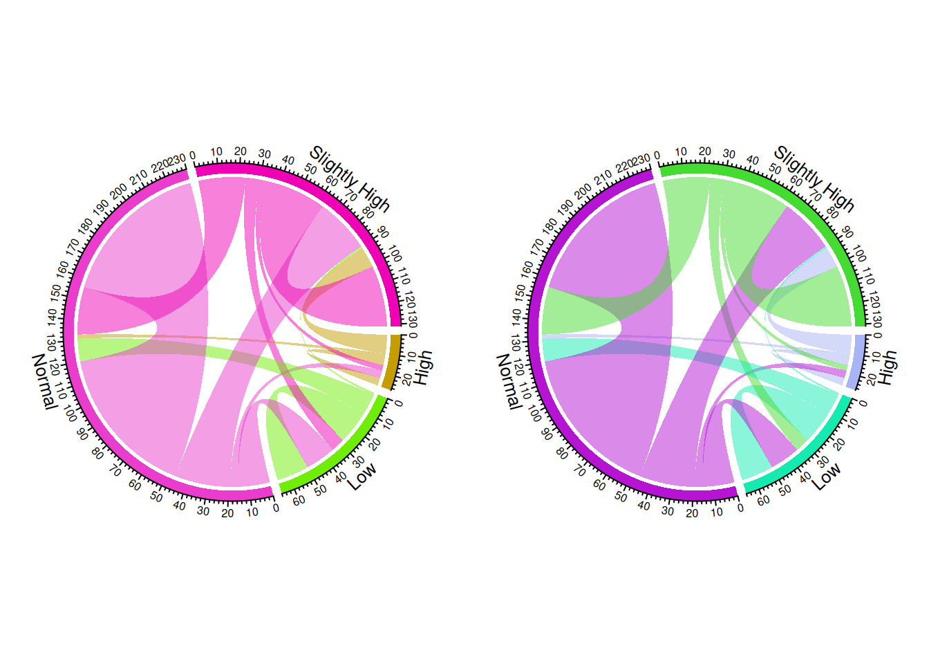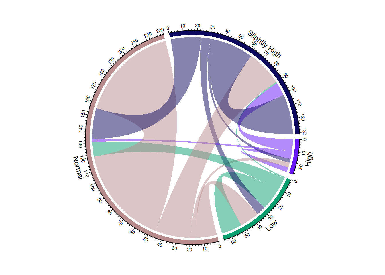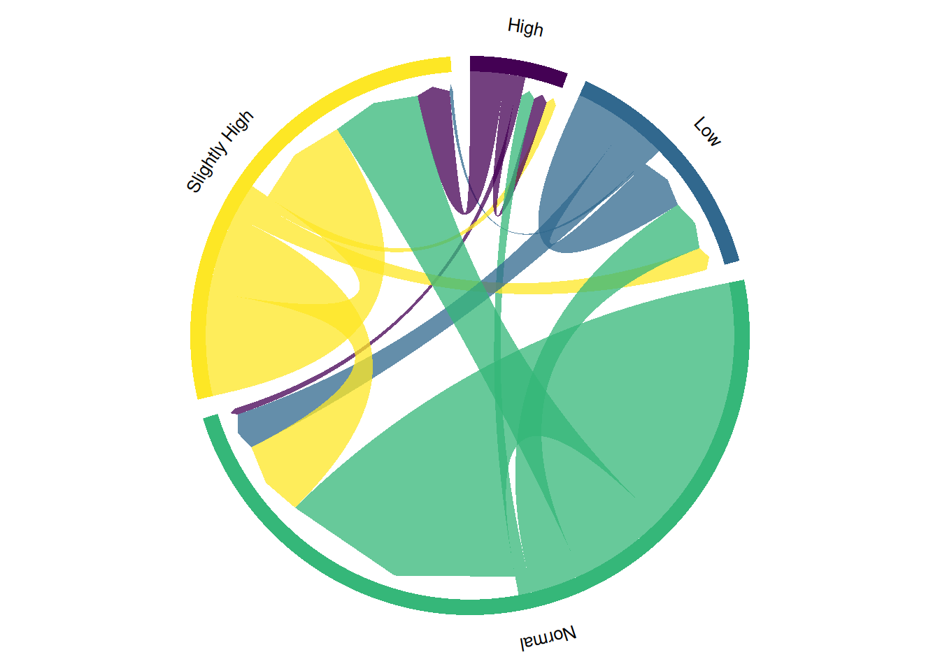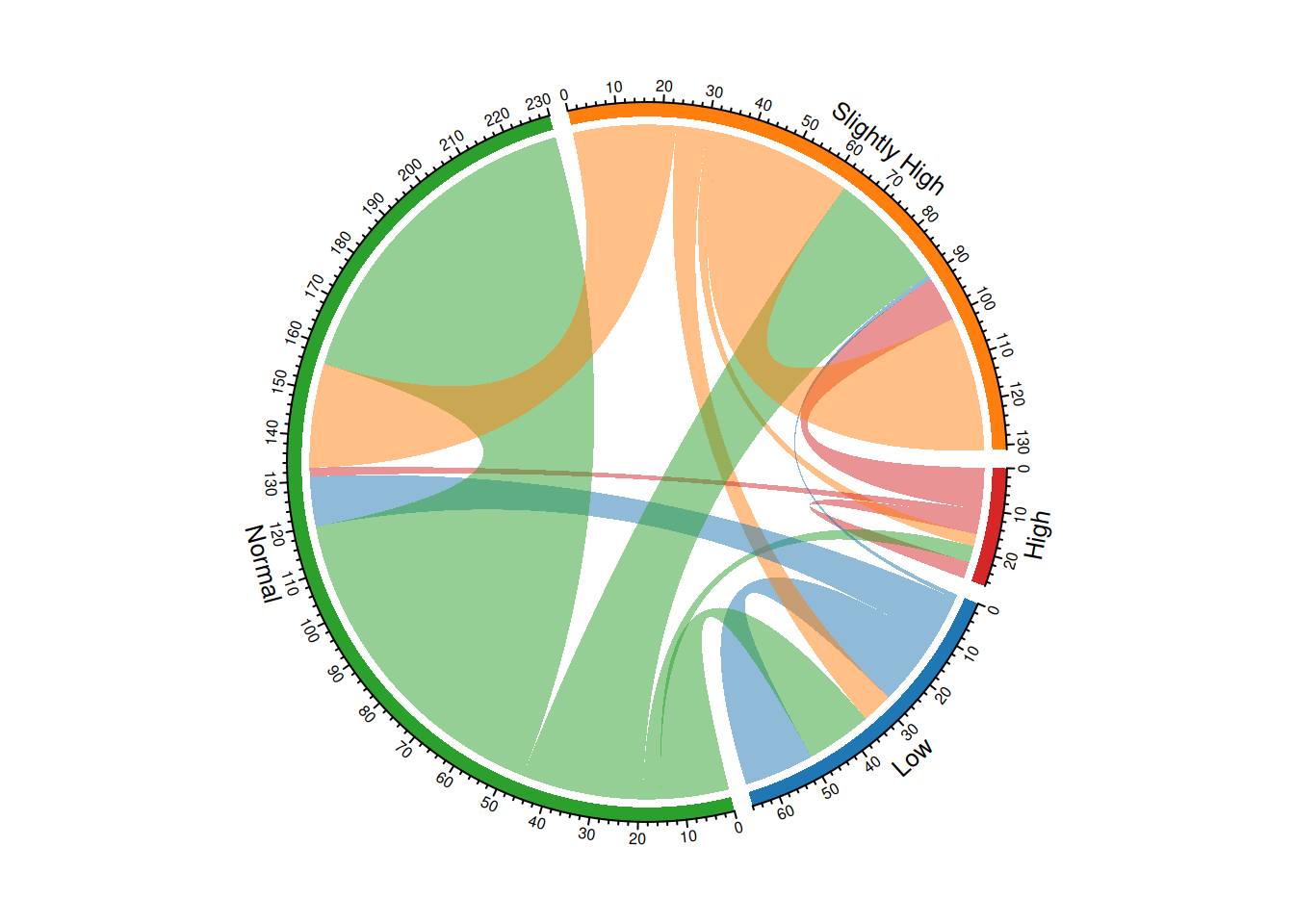 This chord graph shows the changes in blood glucose levels before and after taking a certain medication. Each arc represents a blood glucose level. The width of the chord represents the number or frequency of changes. Adjust the transparency; the chord color will be semi-transparent for clearer observation of the data flow.