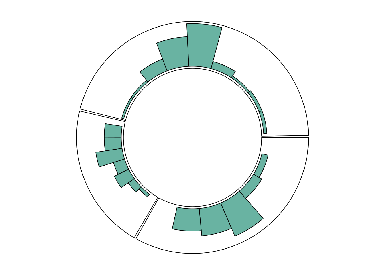Chord diagrams can use connecting lines or bars to represent the relationships between different objects. The connections in a chord diagram directly show the relationships between different objects; the width of the connection is proportional to the strength of the relationship, and the color of the connection can represent another mapping of the relationship, such as the type of relationship. The size of the sectors in the diagram represents the measurement of the objects.