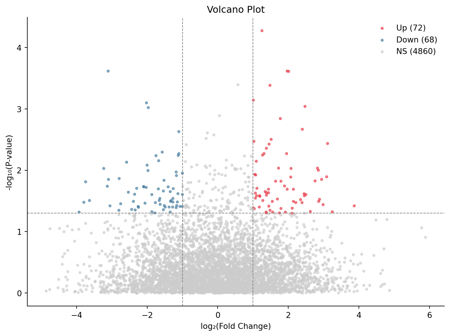colors = {'Up': '#e63946', 'Down': '#457b9d', 'NS': '#cccccc'}