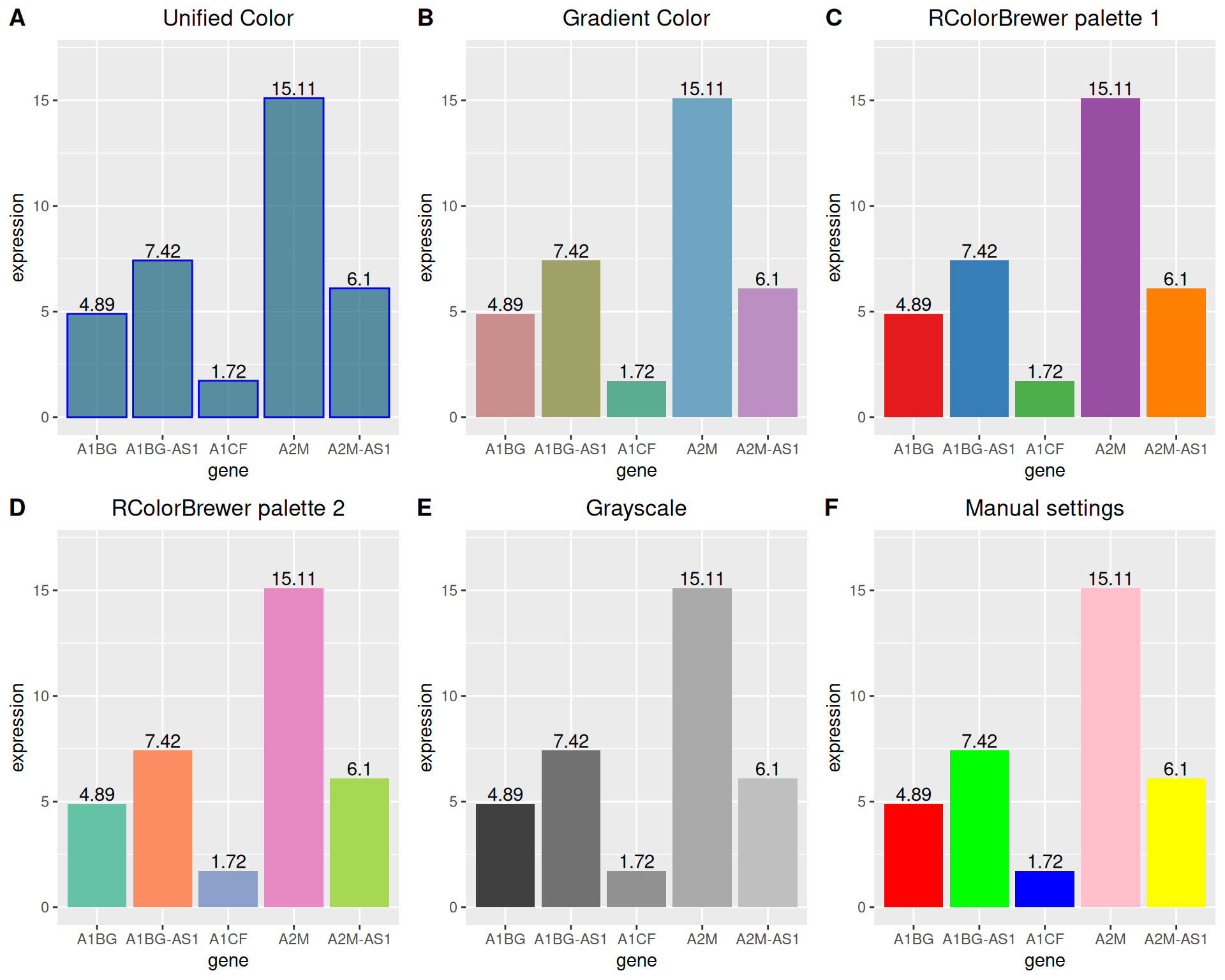 ggplot2 can implement a variety of color settings. Here we provide six examples.
