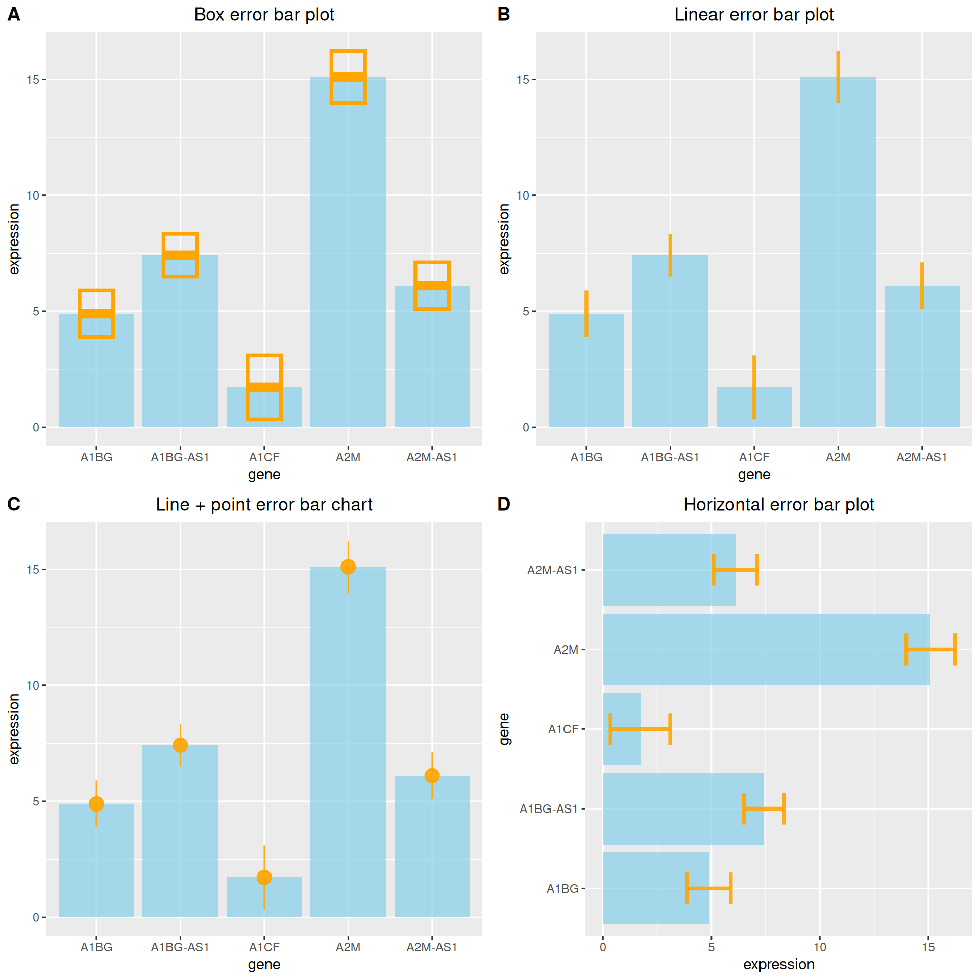 At the same time, ggplot2 provides a variety of error bar types, here we provide four examples.