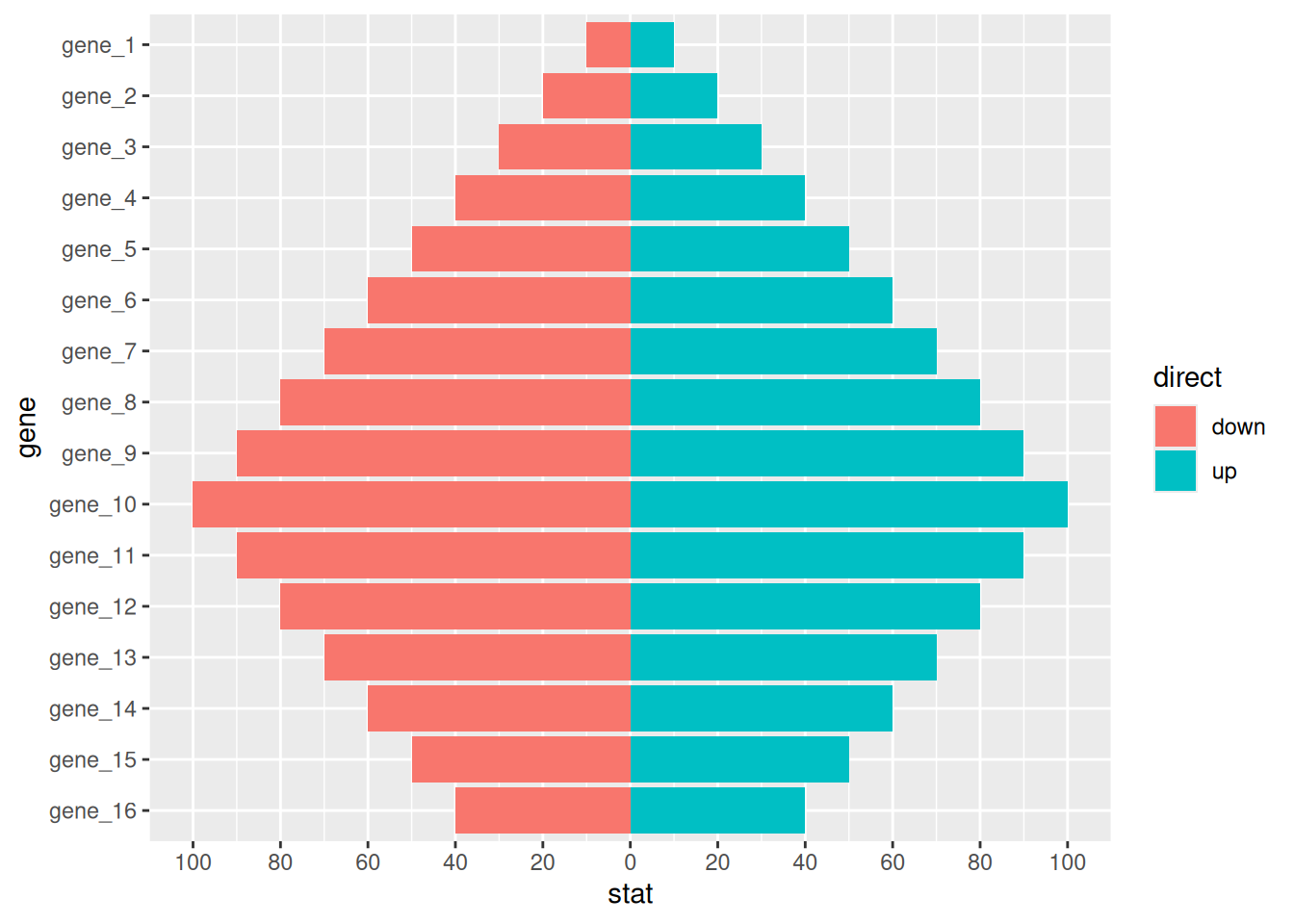 ggplot(df, aes(gene, stat, fill = direct)) +