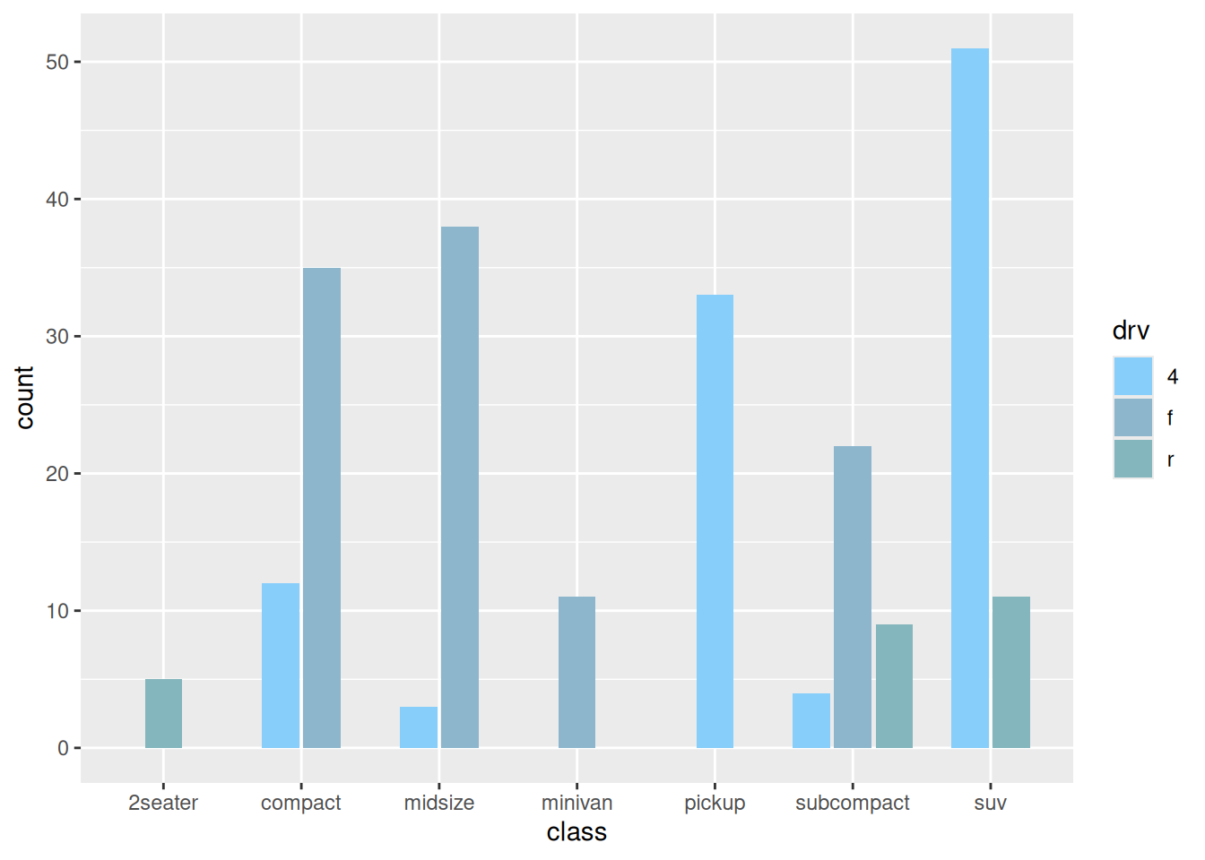 When including grouping within groups, we can also draw side-by-side bar plot by setting the position parameter.