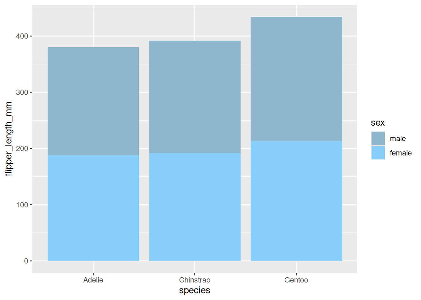 A stacked bar chart showing the wing length of penguins of different sexes.