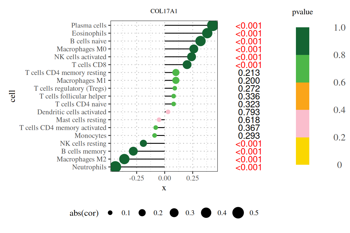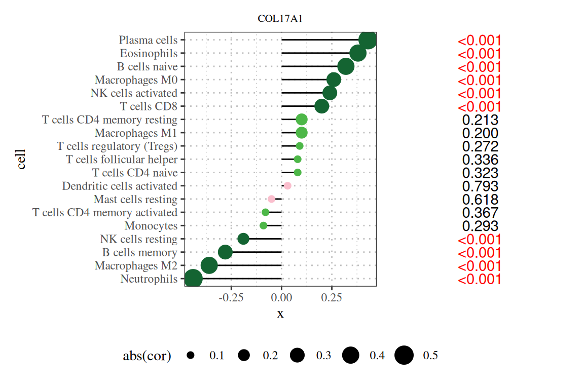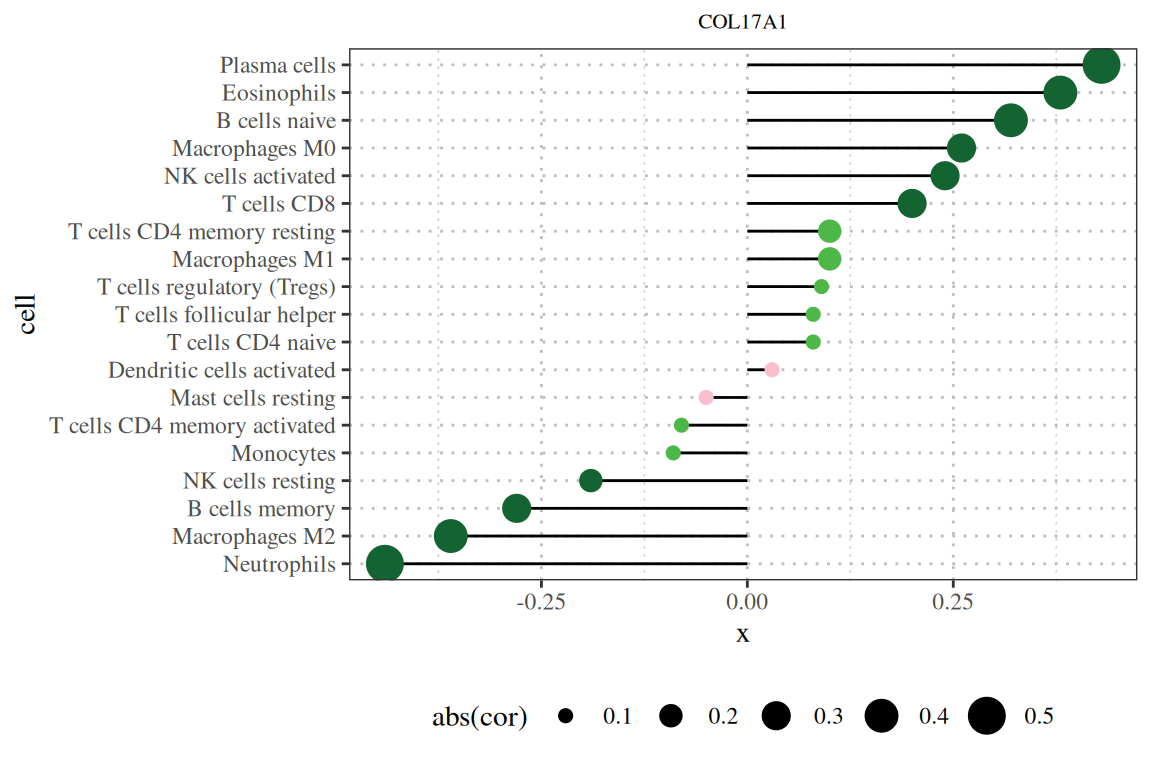 棒棒糖图(原文图9A)的应用展示了COL17A1基因与免疫浸润相关性的结果。[1]