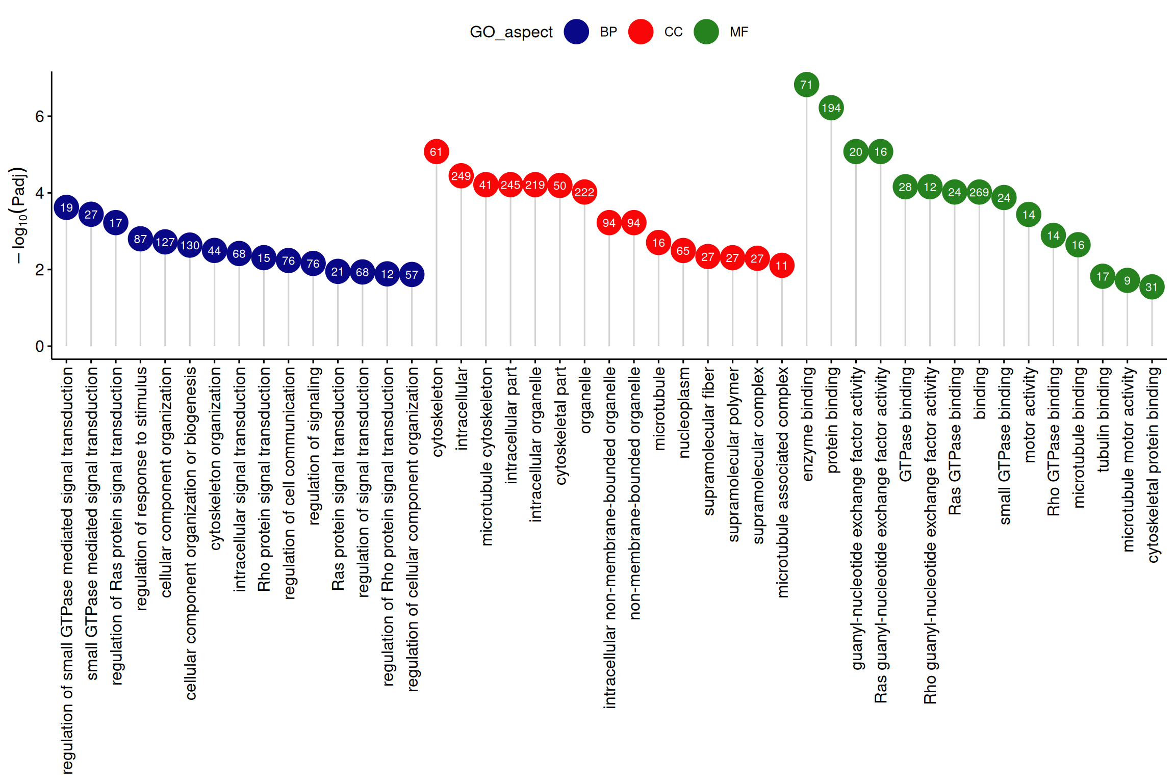 注:纵轴为-log10Padj,横轴为GO条目,颜色为GO类别,圆圈中数字为富集到各GO条目的基因个数。