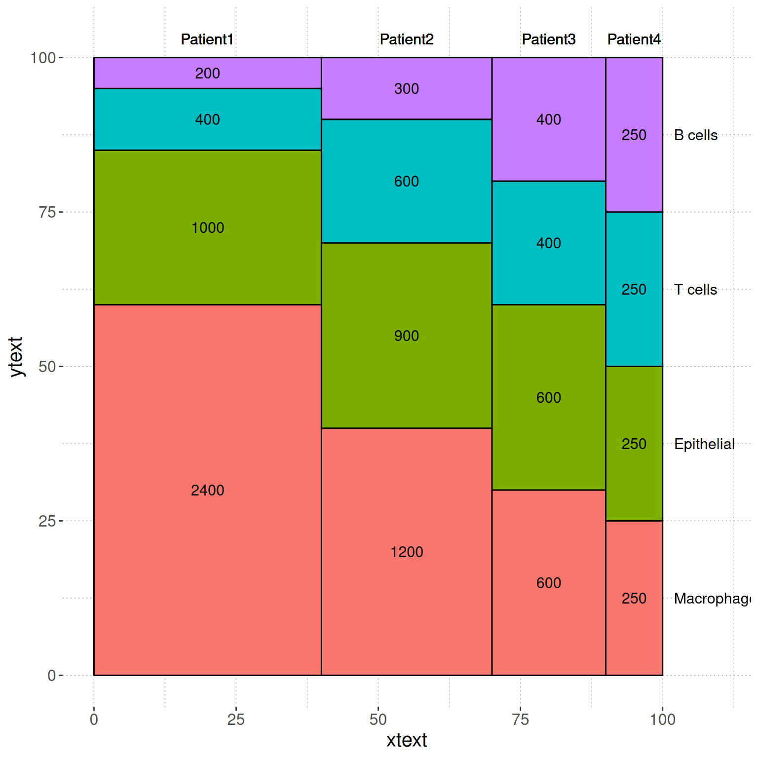geom_text(aes(x = 102, y = seq(12.5,100,25), label = c("Macrophage","Epithelial","T cells","B cells")), size = 4,hjust = 0)+