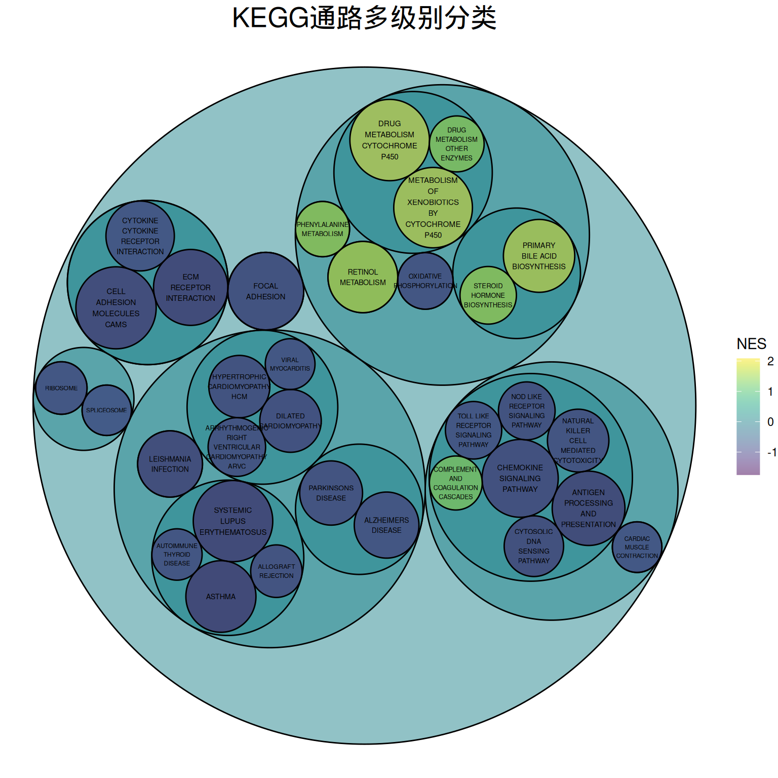 上图为KEGG通路多级别分类的包珠图,最小级别圆圈的大小表示log10(P)的负值,圆圈越大表示相关程度越大。圆圈颜色表示NES值。