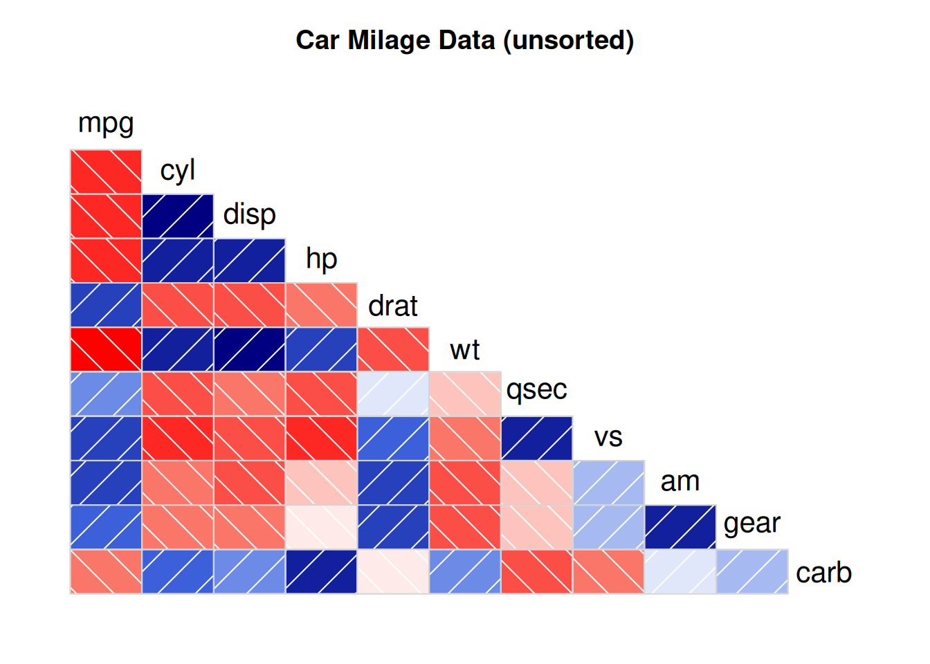 例如上图则为mtcars数据集中各组数据的相关性热图,用颜色来表示不同组别数据的两两相关性,颜色的深浅代表了P值的大小。