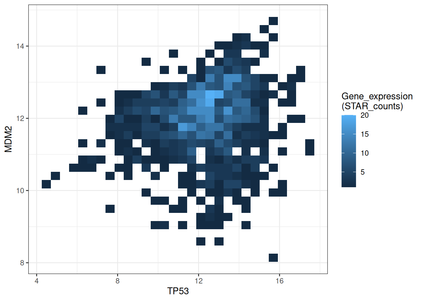 此六边形图展示了TP53和MDM2基因表达的关系。颜色越深表示该区域的样本密度越低,而颜色较浅表示样本密度较高。