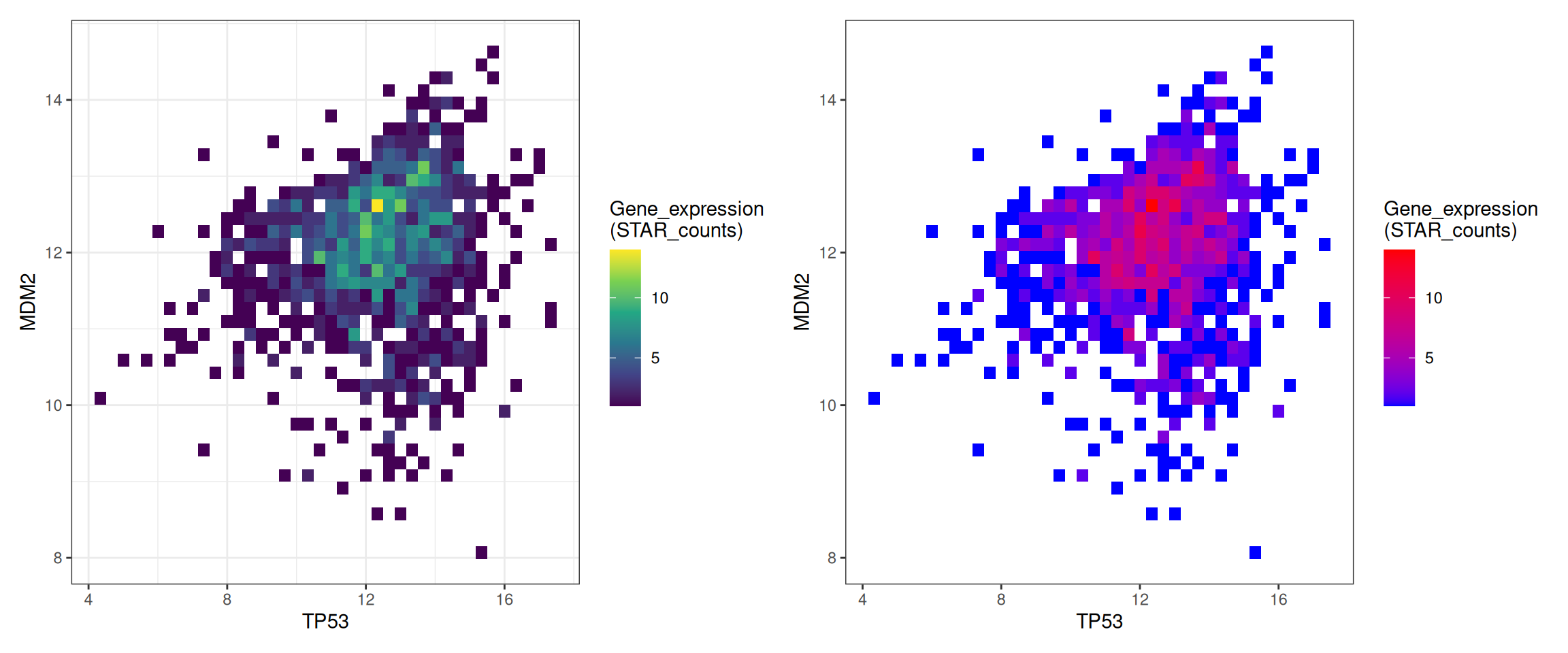 此图对比了不同调色板设置下的TP53和MDM2基因表达的二维密度分布,通过不同调色板的比较,可以观察到密度图在可视化表达上的差异,帮助选择更适合展示数据特征的颜色方案。