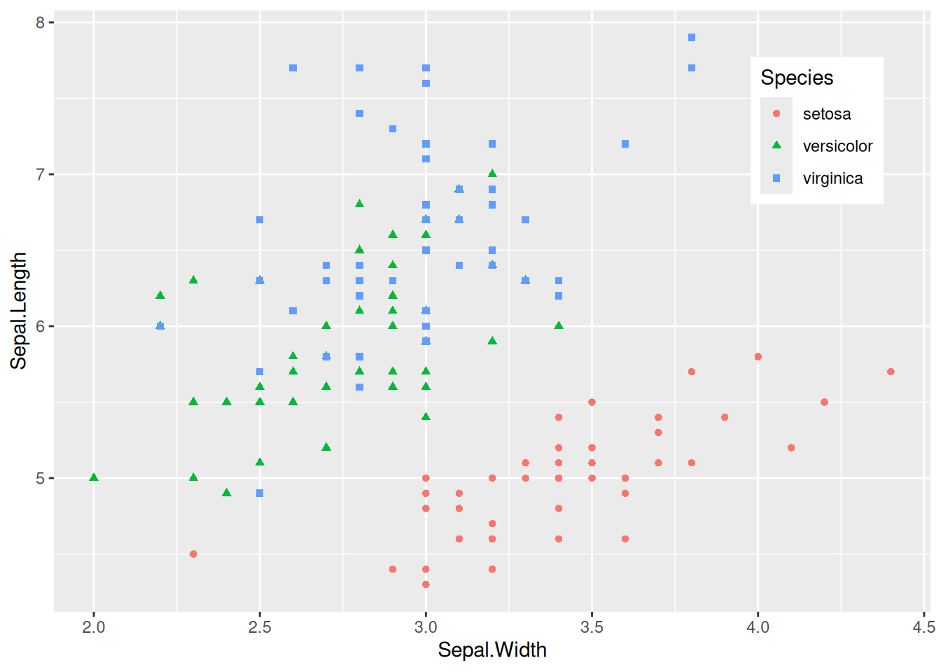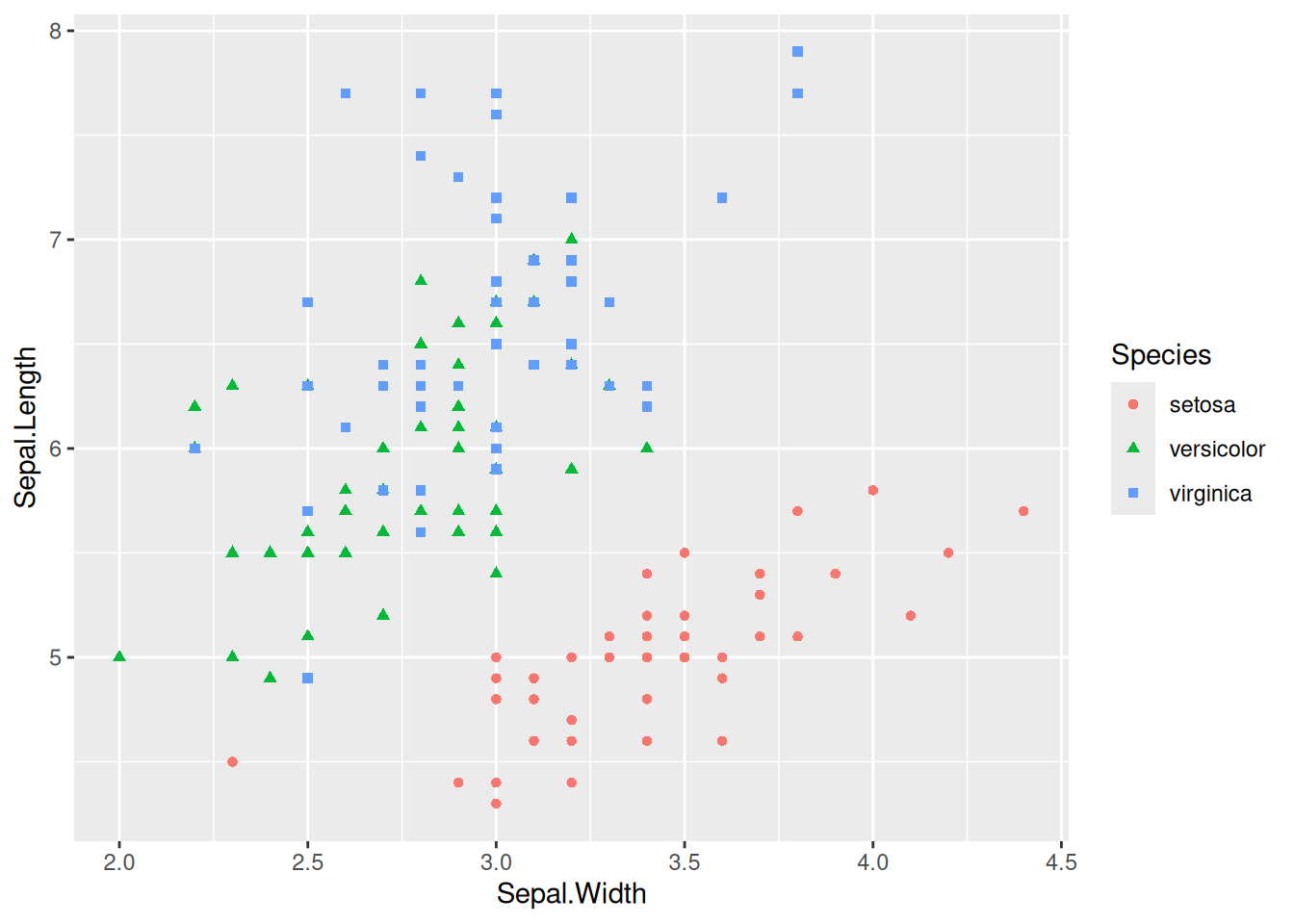 p <- ggplot(data, aes(x = Sepal.Width, y = Sepal.Length, color = Species, shape = Species)) +