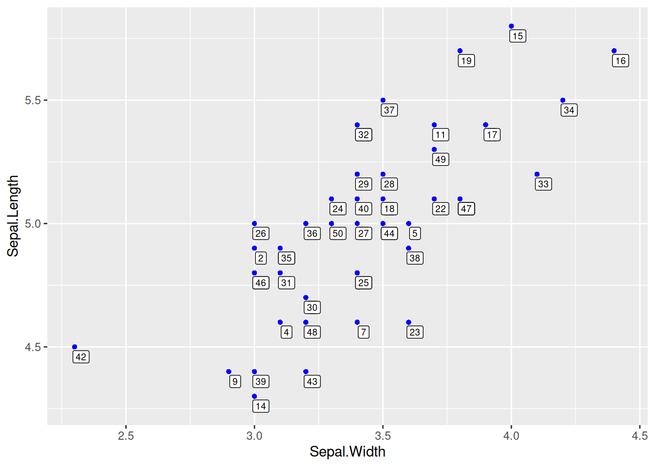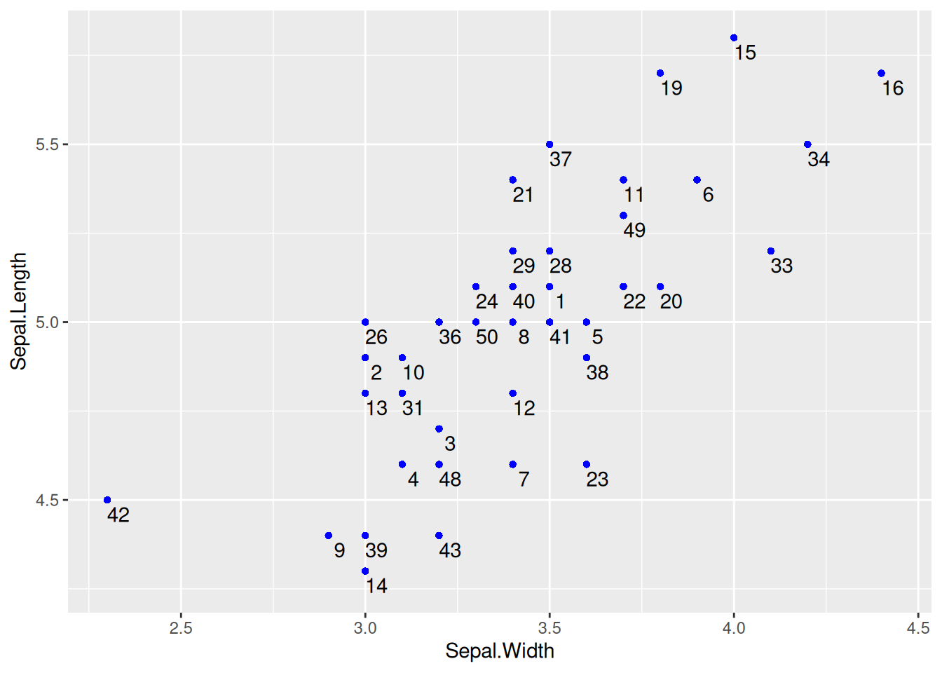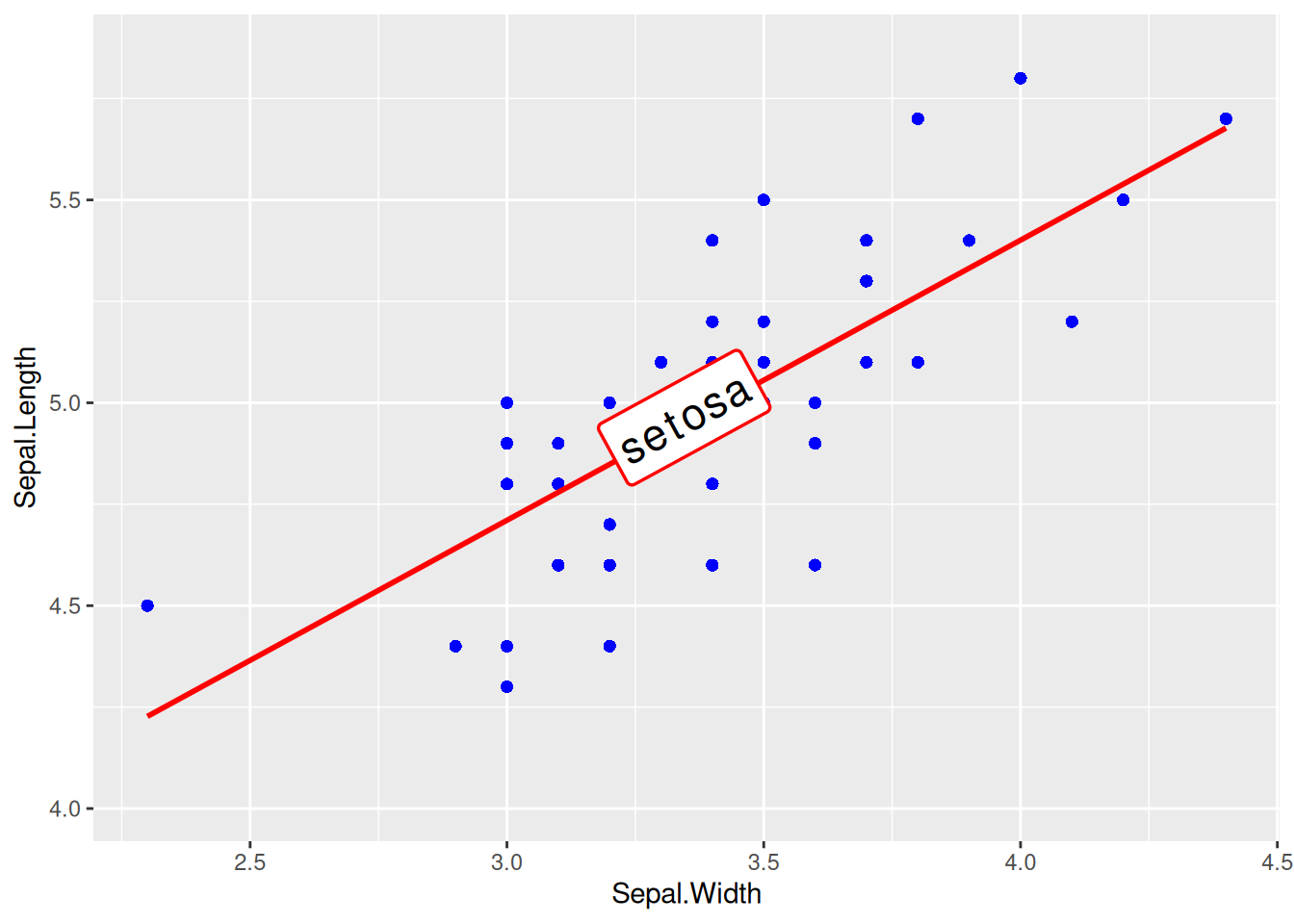 p <- ggplot(data[data$Species == "setosa", ], aes(x = Sepal.Width, y = Sepal.Length)) +