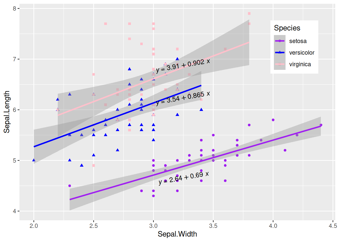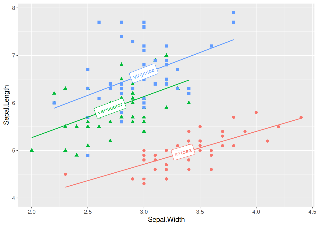 p_multi <- ggplot(data, aes(x = Sepal.Width, y = Sepal.Length, color = Species, shape = Species)) +