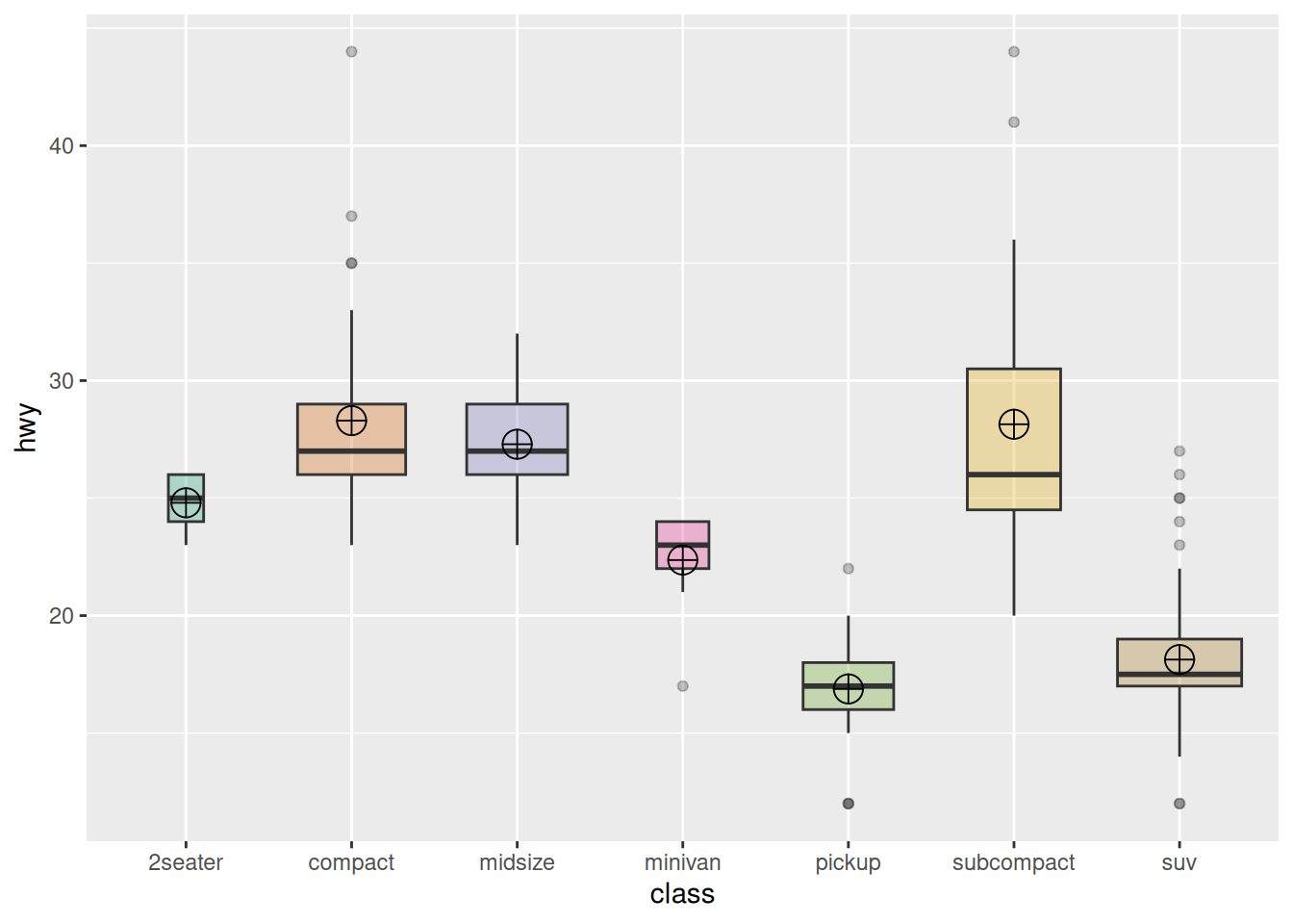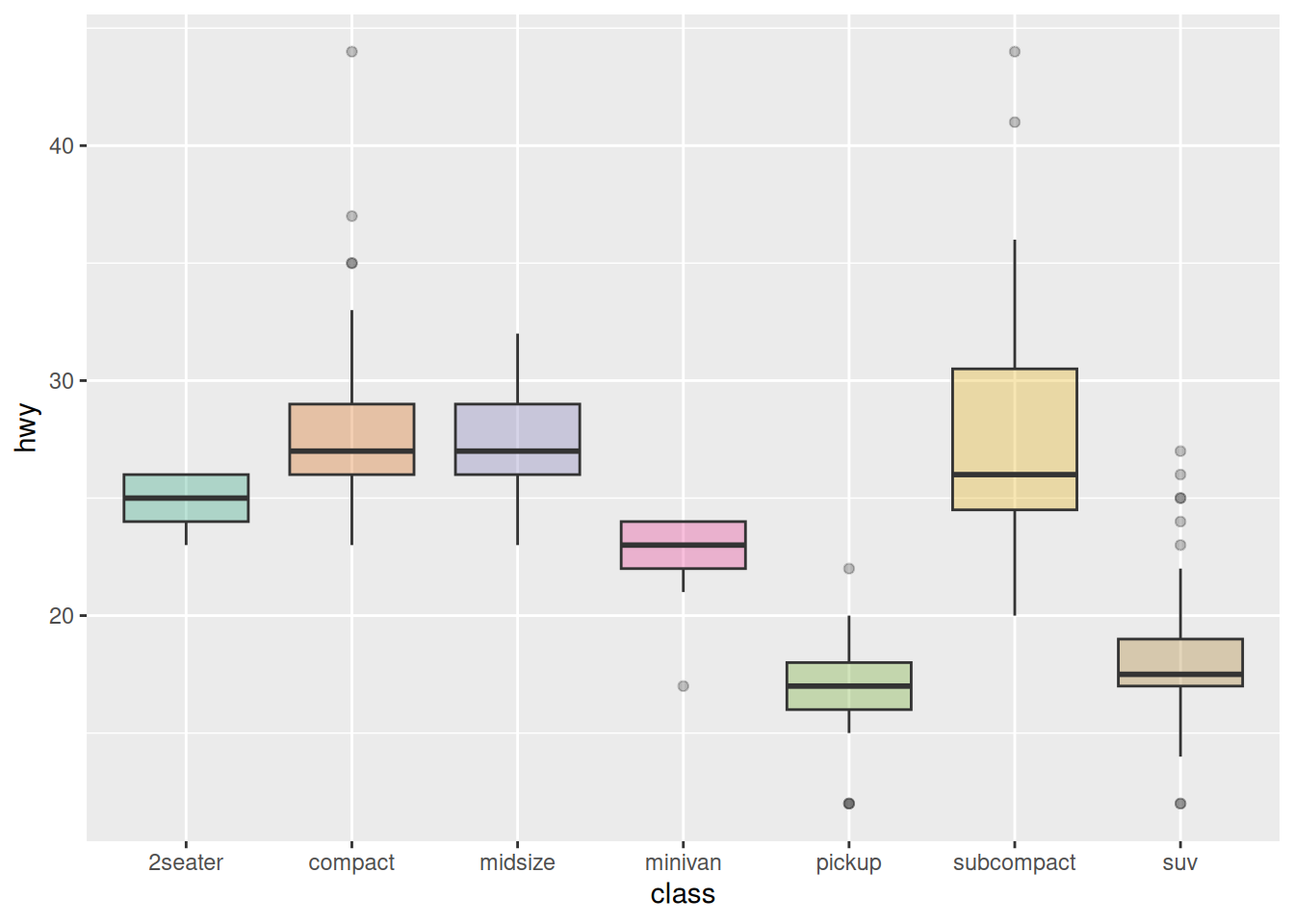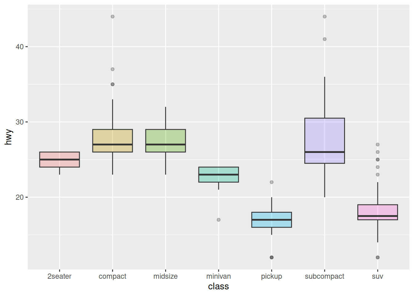 ggplot(aes(x=class, y=hwy, fill=type, alpha=type)) +