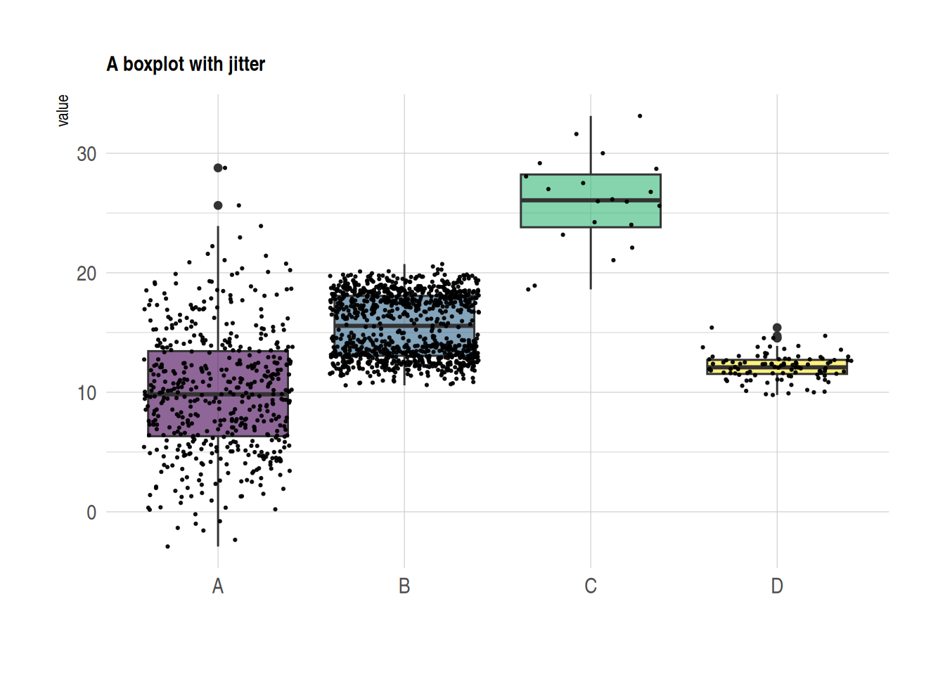 箱线图常用来比较多个组的分布,但具体数据的分布则无法表示(例如正态分布与双峰分布无法通过箱线图判断)。我们可以通过geom_jitter()函数添加独立观察,看到各组具体分布情况。