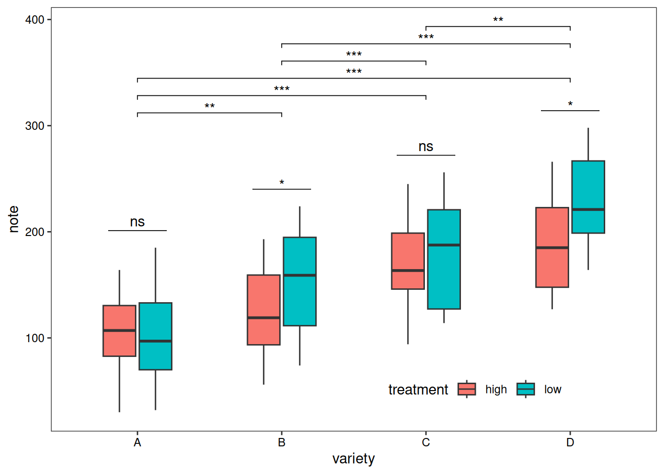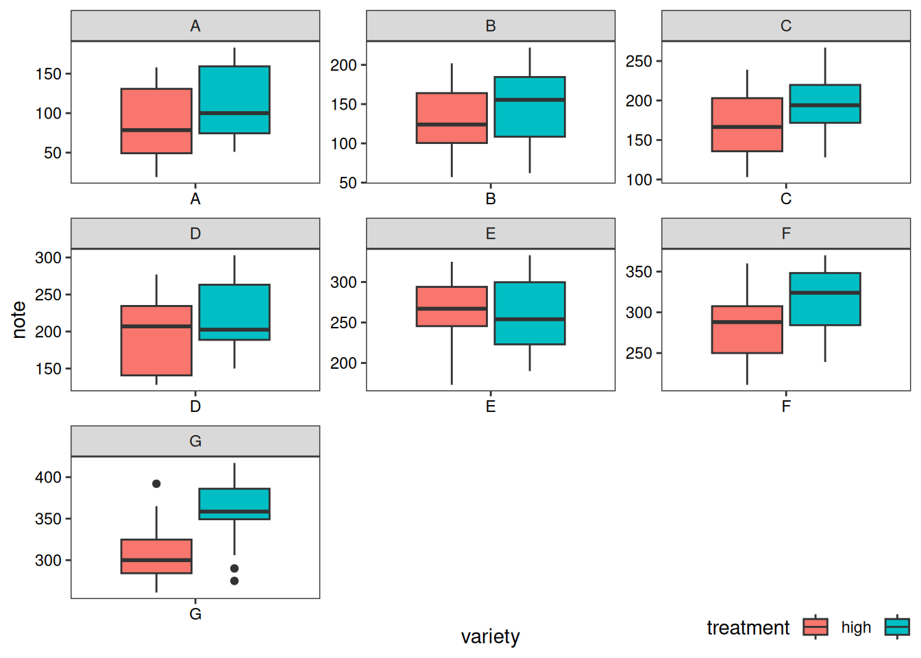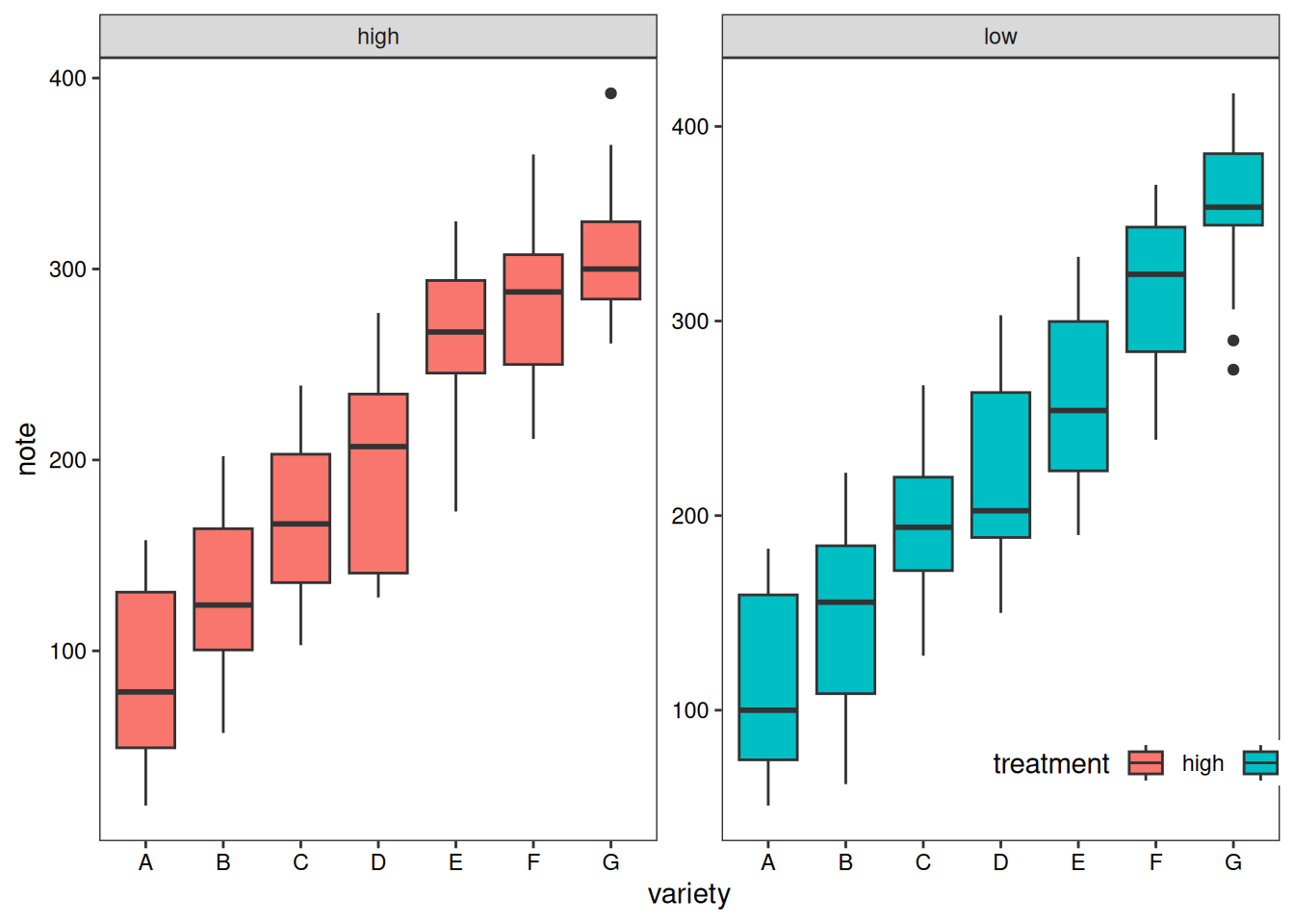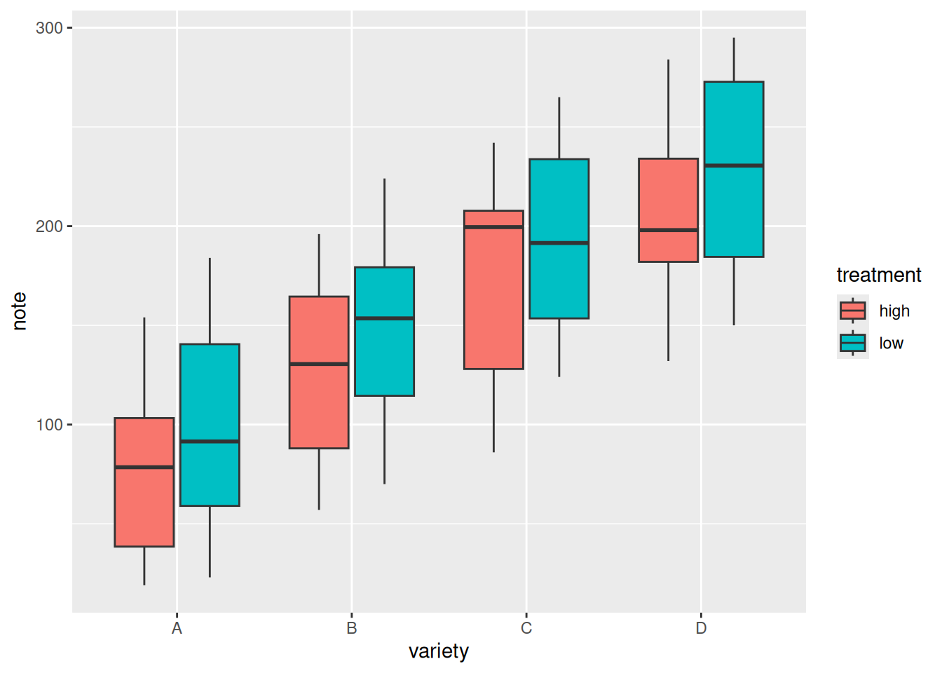 geom_boxplot(data = df,mapping = aes(x=variety, y=note, fill=treatment),width=0.5)+