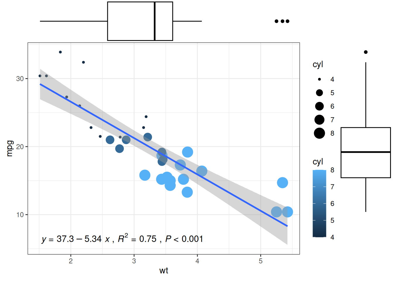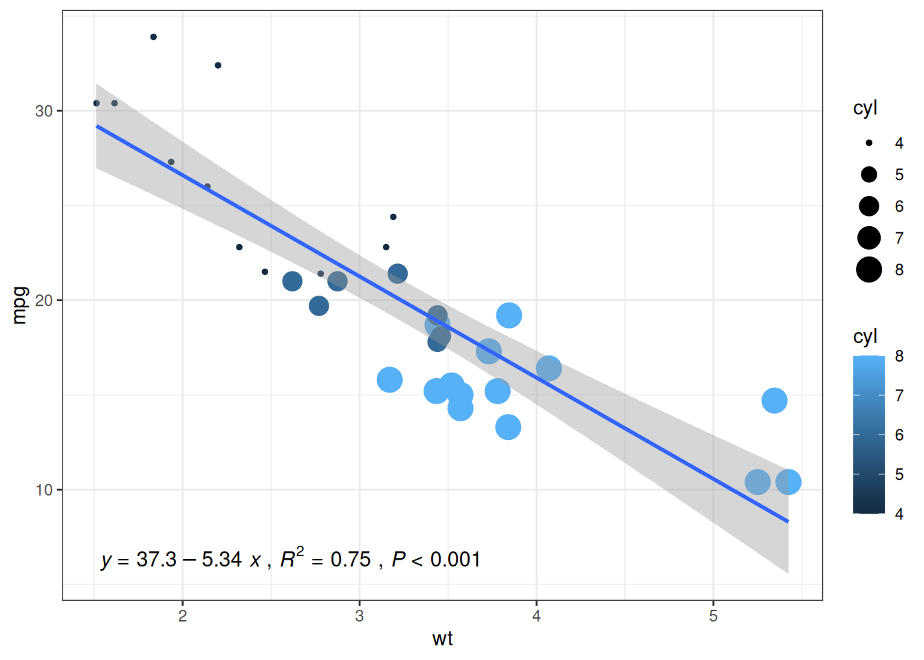 p1<-ggplot(data_mtcars, aes(x=wt, y=mpg, color=cyl, size=cyl))+