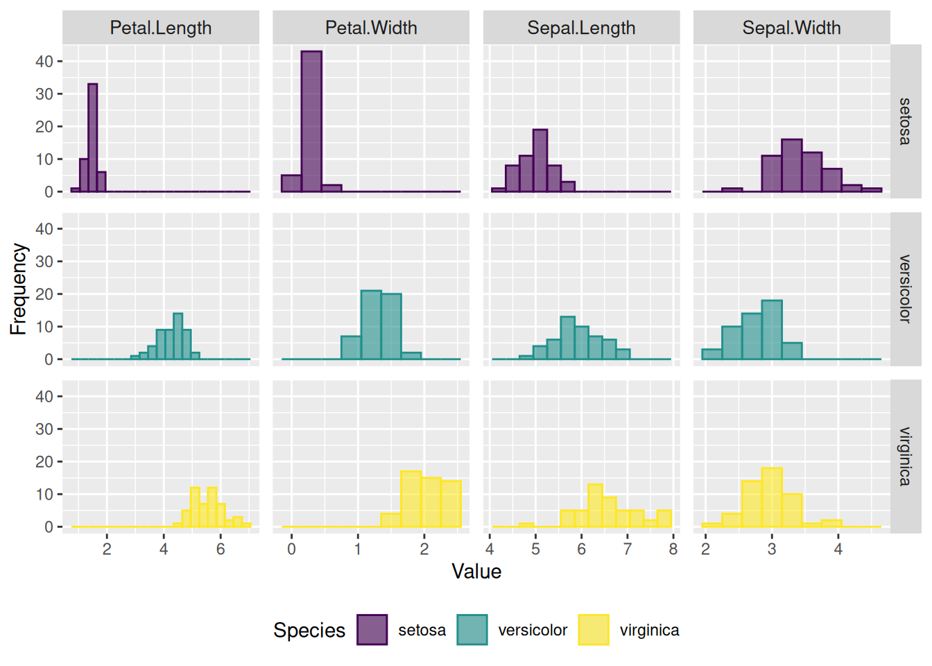 ggplot(aes(x = value, color = Species, fill = Species)) +