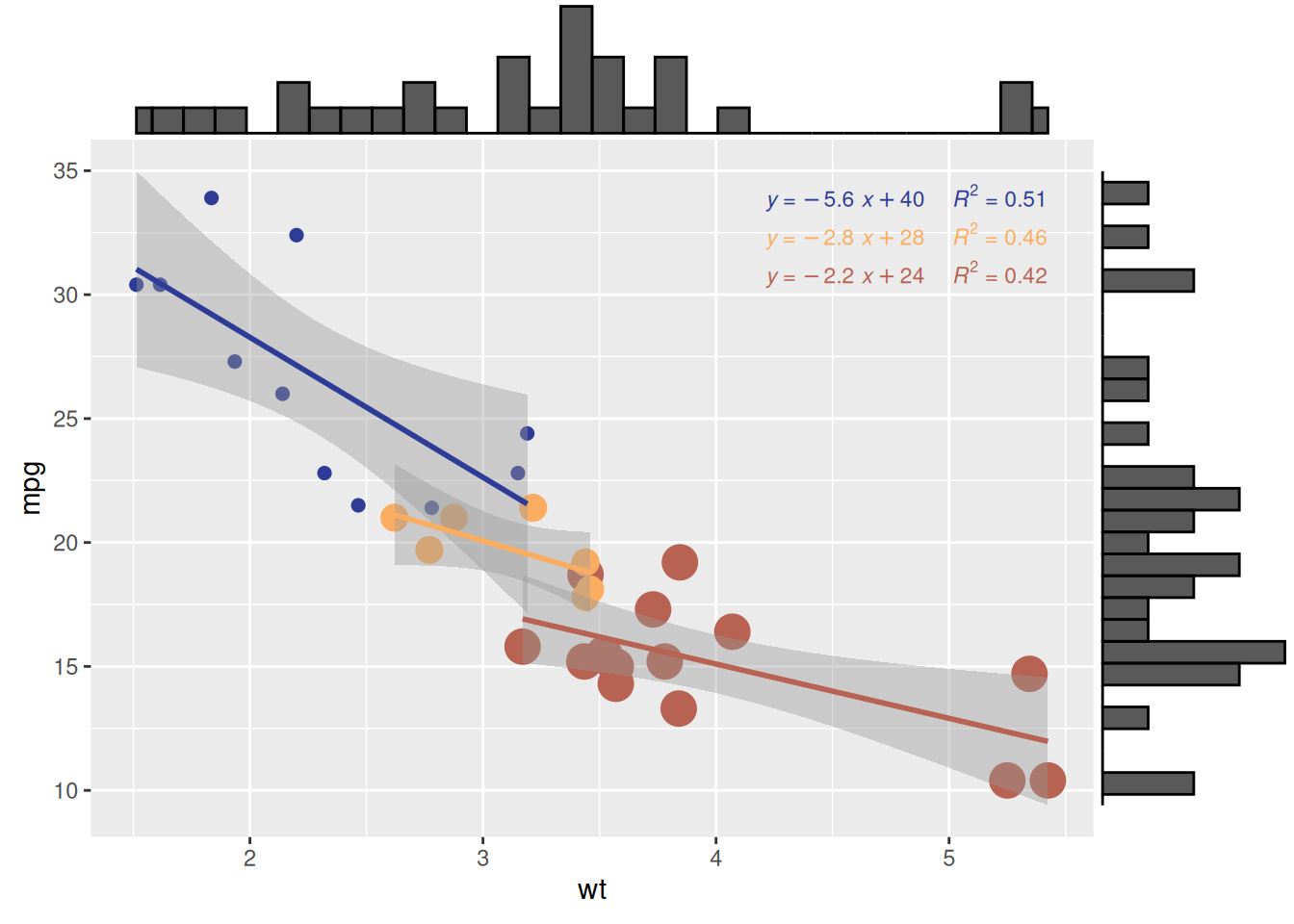 p <- ggplot(mtcars, aes(x = wt, y = mpg, color = factor(cyl), size = factor(cyl))) +