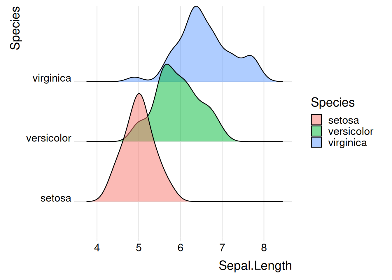 p1_1 <- ggplot(iris, aes(x = Sepal.Length, y = Species, fill = Species)) +
