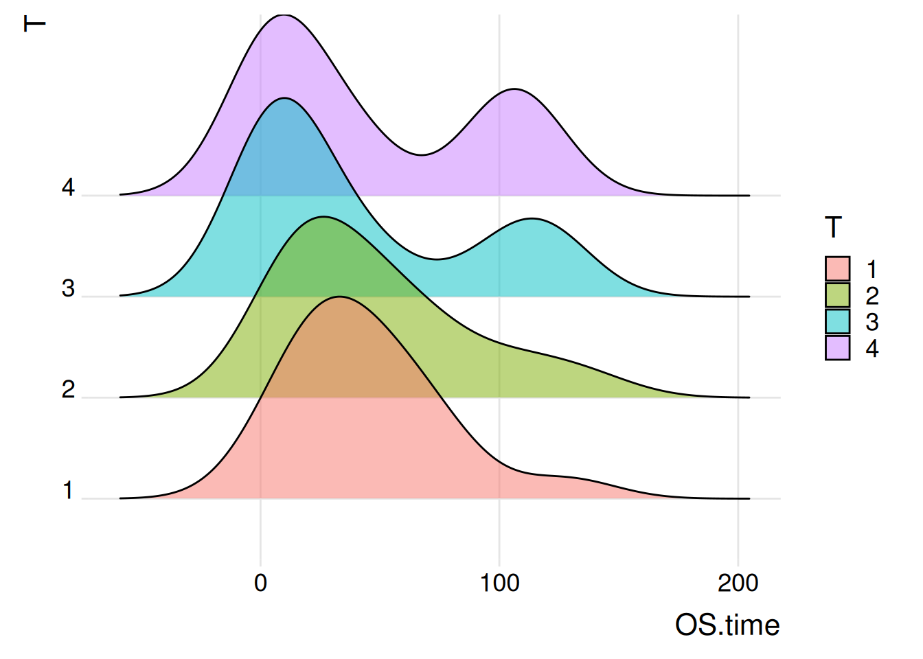 p2_2 <- ggplot(TCGA_clinic, aes(x = OS.time, y = T, fill = T)) +