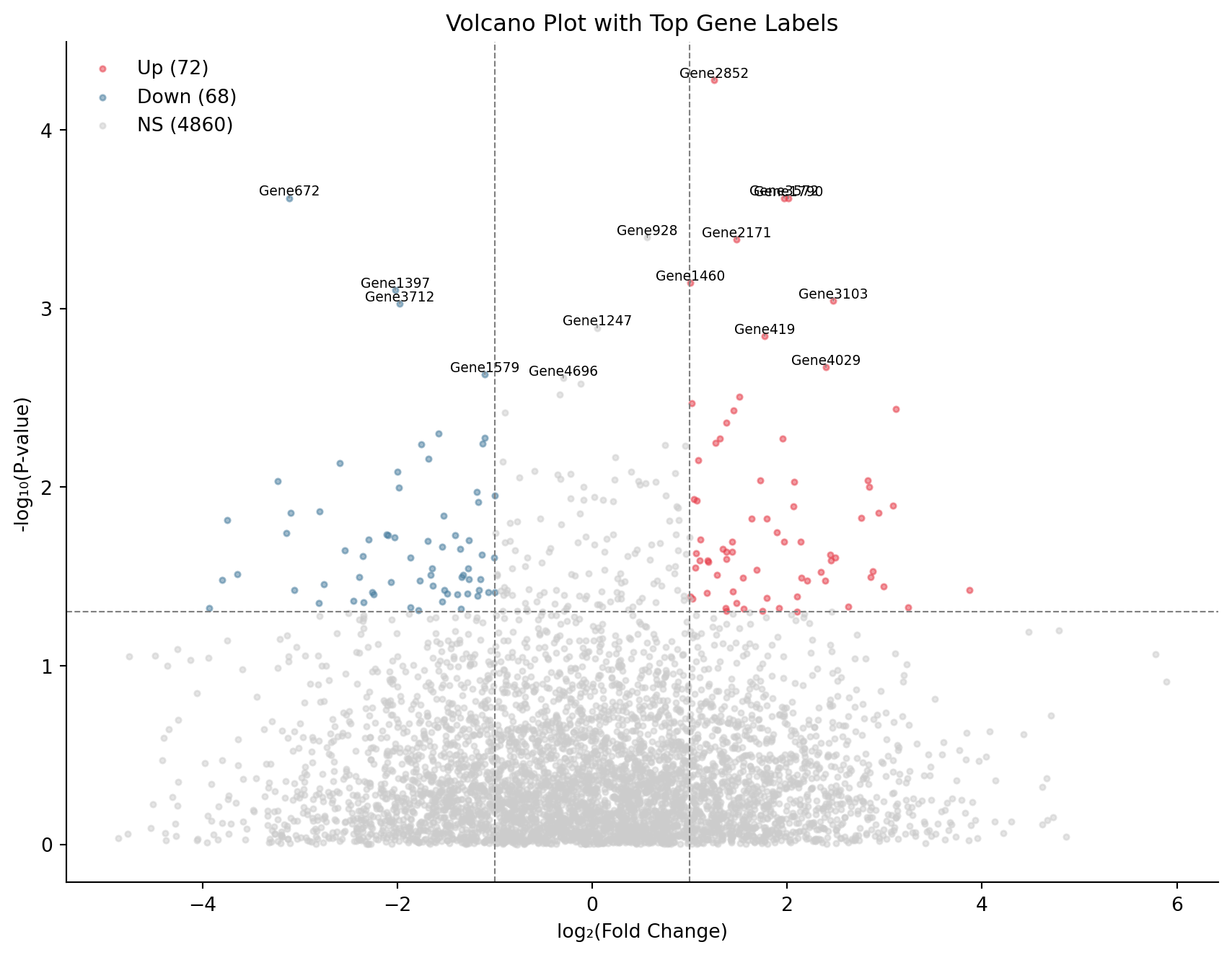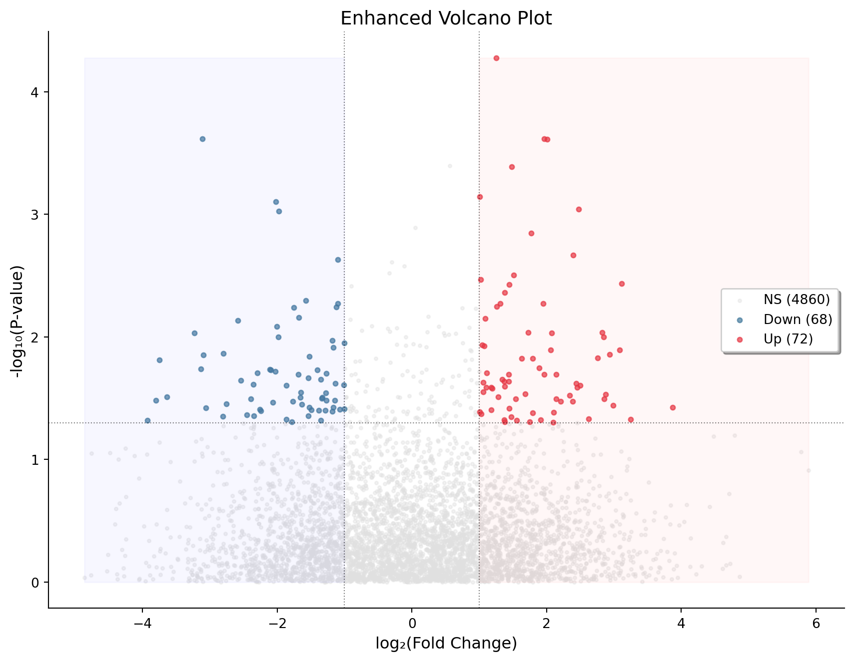 colors = {'Up': '#e63946', 'Down': '#457b9d', 'NS': '#cccccc'}