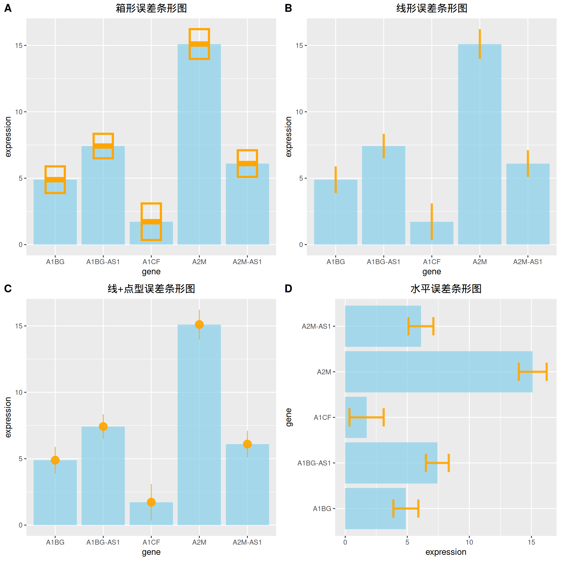 同时,ggplot2提供了多种误差线的类型,这里我们提供四种示例。